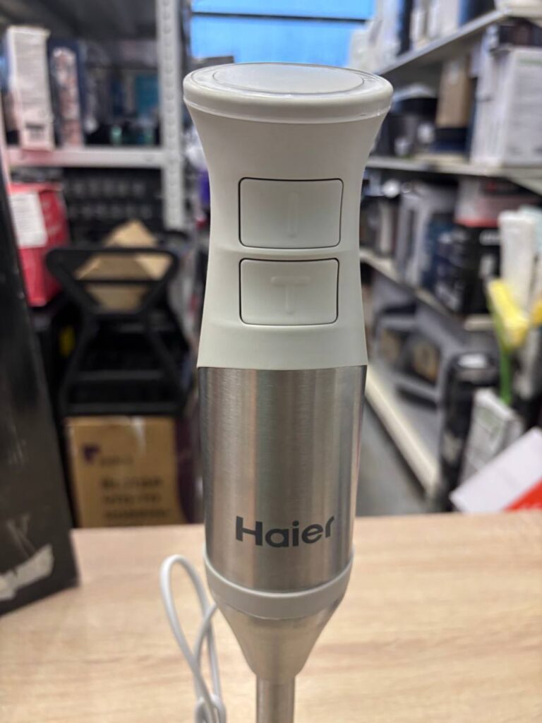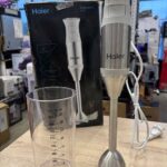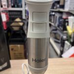 Серебристый погружной блендер Haier HB-501 с металлической погружной частью позволит вам готовить соусы, фарш, колоть лед, измельчать орехи.