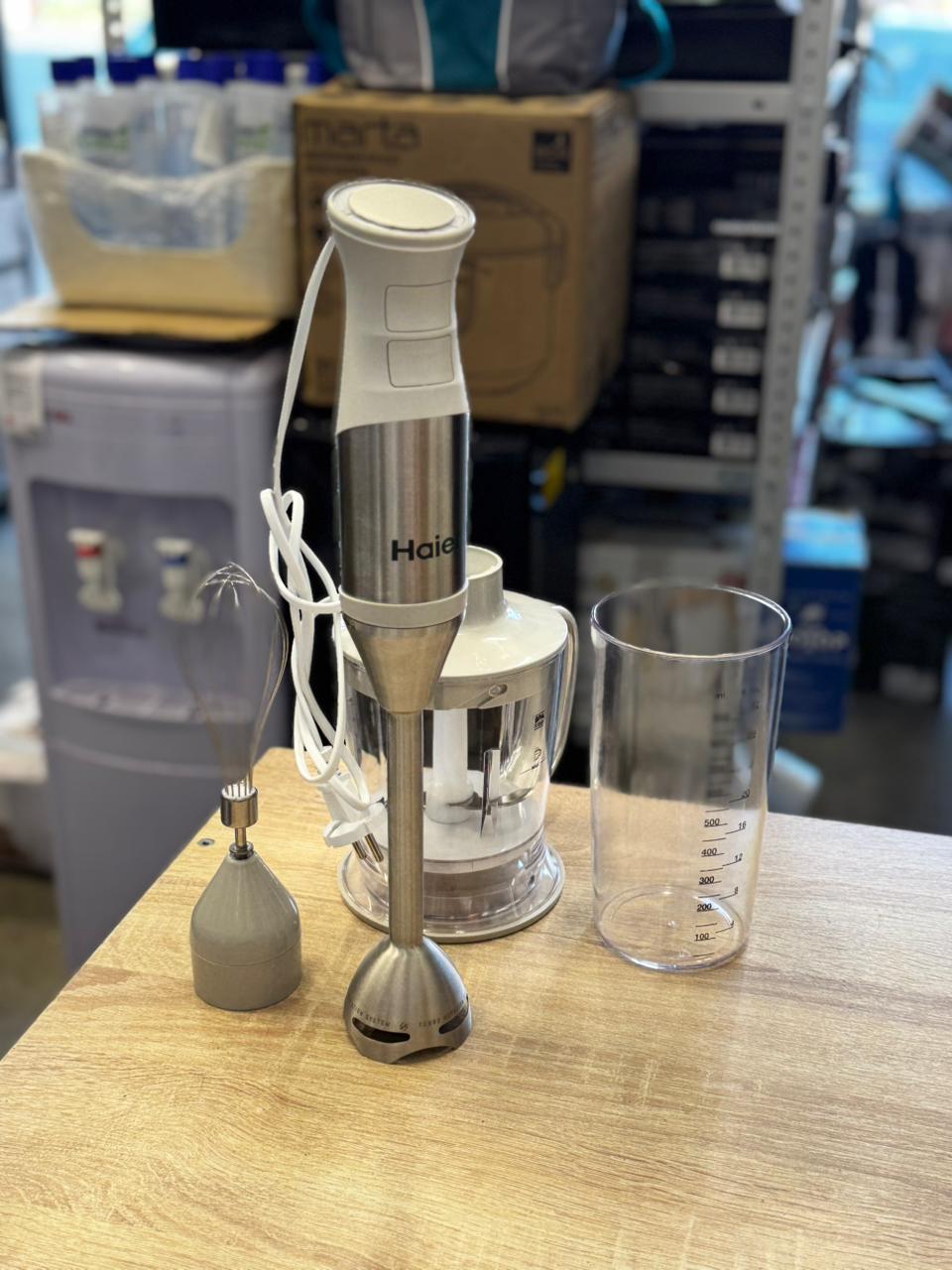 Серебристый погружной блендер Haier HB-501 с металлической погружной частью позволит вам готовить соусы, фарш, колоть лед, измельчать орехи.