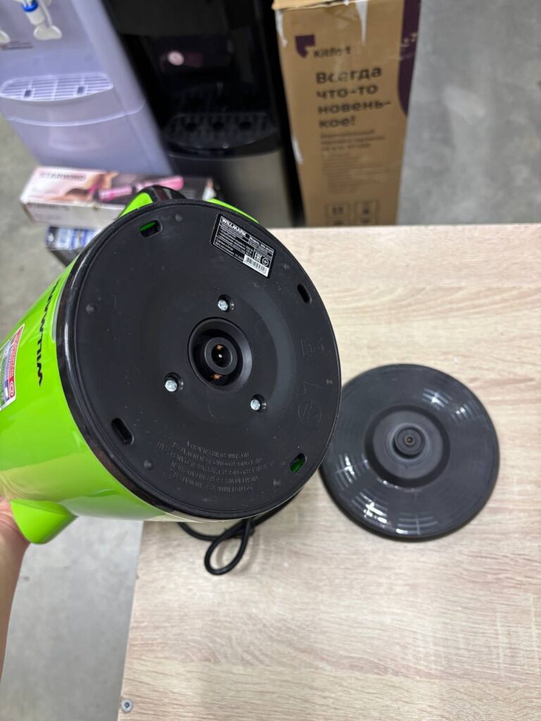 Электрочайник Willmark WEK-2012PS салатового цвета обладает массой 1,2 кг. Габариты устройства составляют 22х17х19 см.