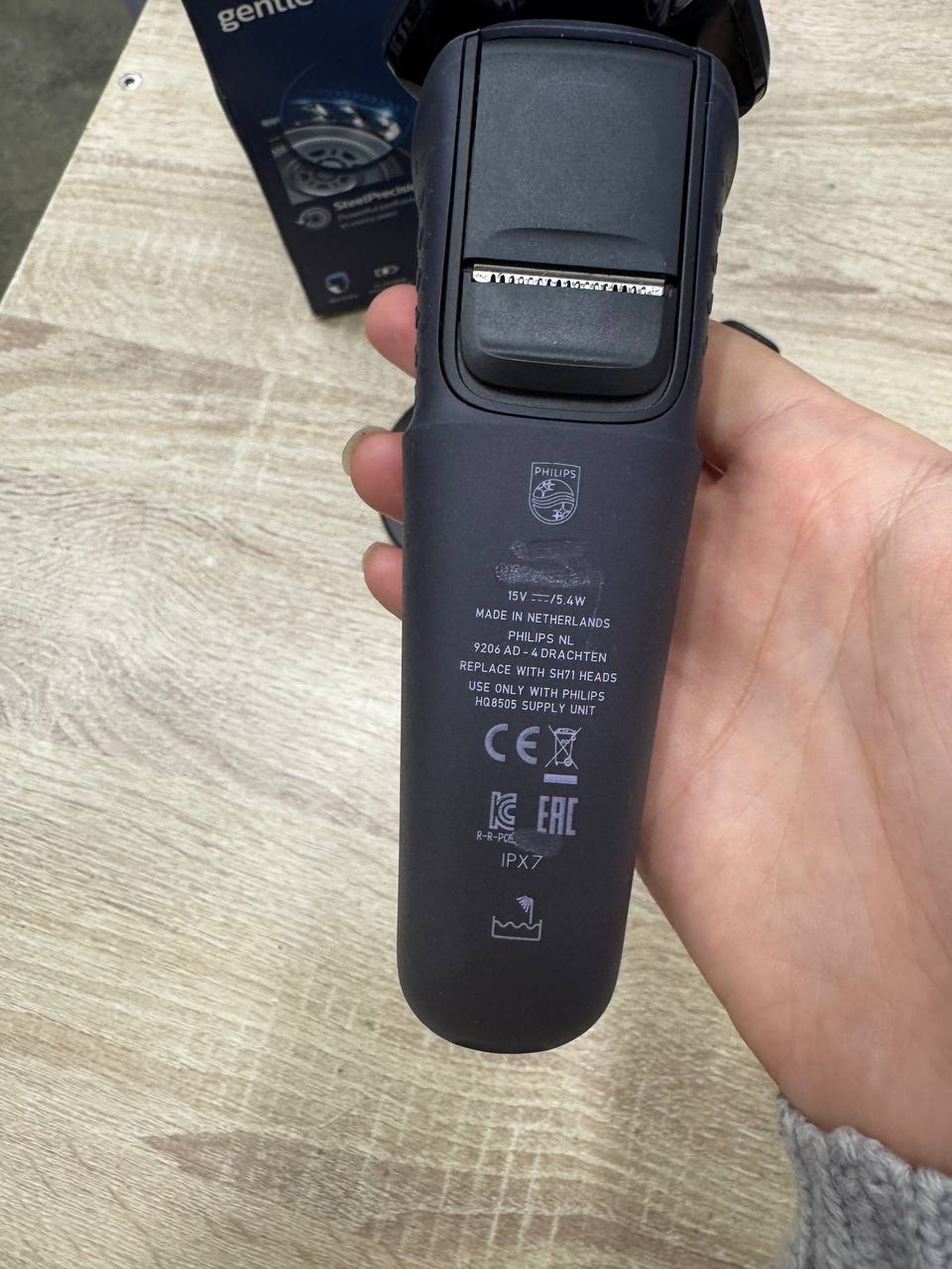 За электропитание отвечает встроенный литиево-ионный аккумулятор, полного заряда которого достаточно для 60 мин беспрерывной работы. Время зарядки составляет 1 ч. Модель оснащена пластиковым корпусом с прорезиненным покрытием, светодиодным дисплеем, индикаторами включения, зарядки и разрядки аккумулятора. Полный комплект включает насадку-триммер, футляр для хранения, щеточку для очистки.