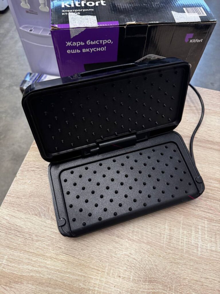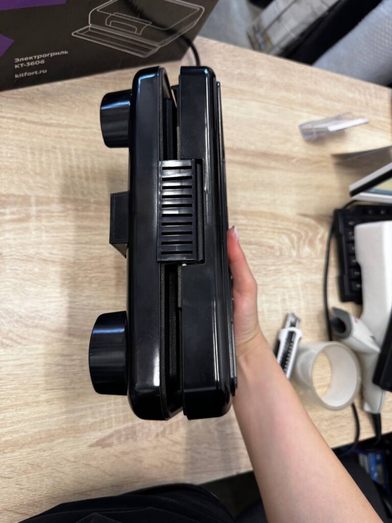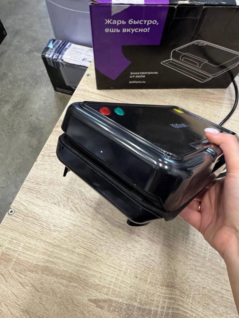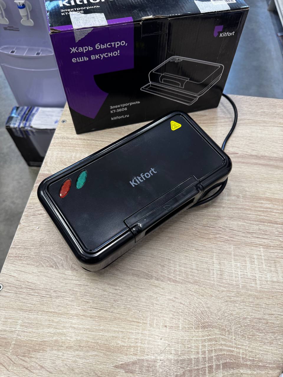 Подключение Kitfort КТ-3606 к сети осуществляется через 0.6-метровый кабель. Конструкция включает лоток, внутрь которого стекает жир и сок. Световые индикаторы оповещают о степени нагрева и готовности модели приступить к работе.