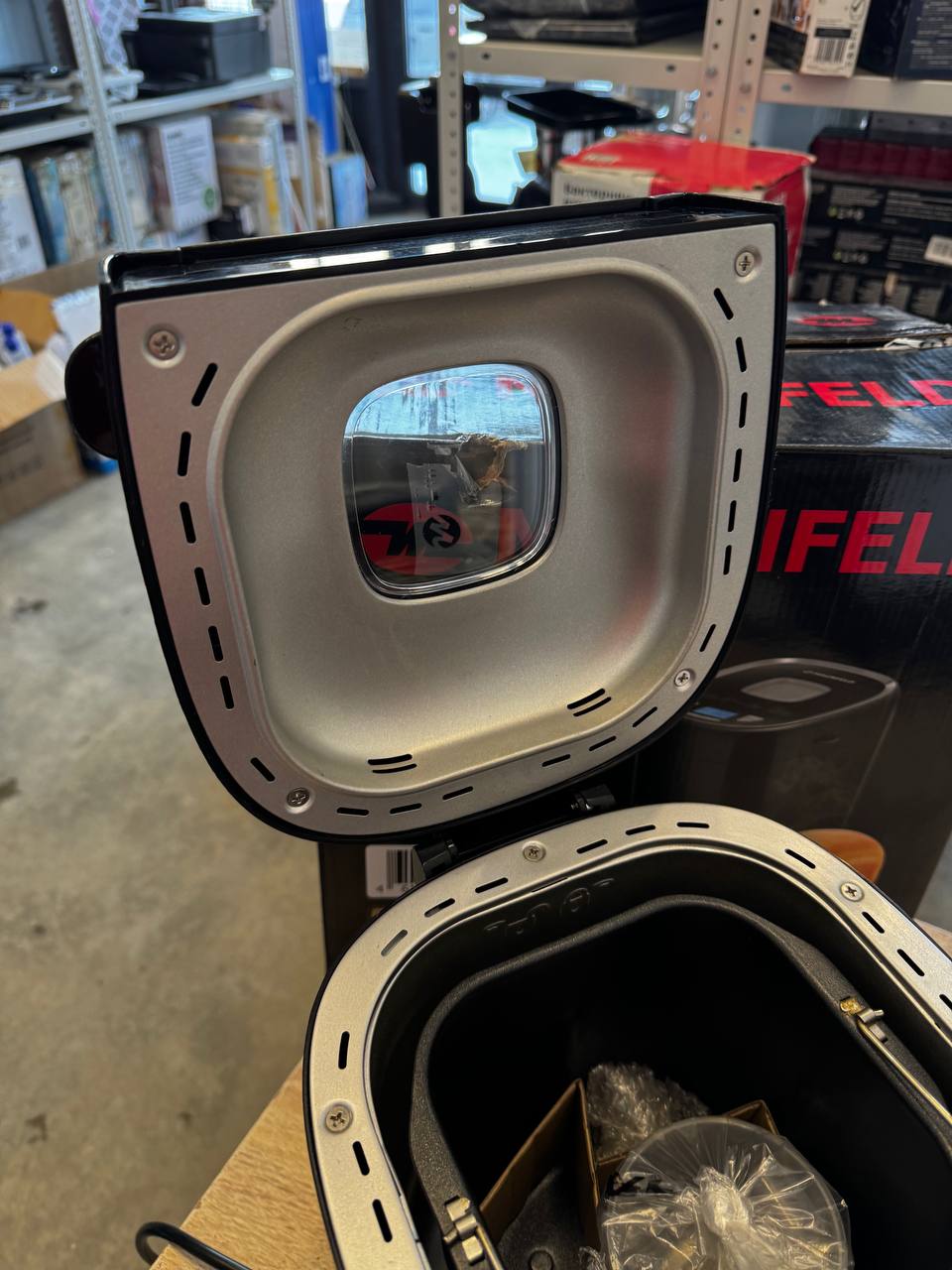 В приборе реализованы функции предварительного нагрева, поддержания температуры, есть возможность выбрать три варианта цвета корочки. Корпус модели сделан из термостойкого ударопрочного пластика, оборудован смотровым окном и съемной крышкой. Прорезиненные ножки обеспечивают устойчивость, специальный отсек позволяет компактно хранить сетевой шнур.