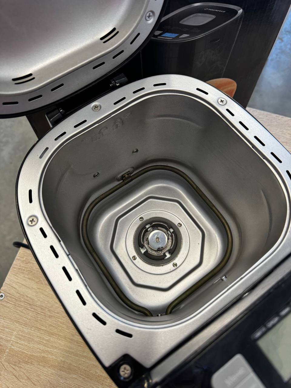 Квадратная форма обладает долговечным антипригарным покрытием. Хлебопечка снабжена диспенсерами для изюма и орехов, дрожжей.