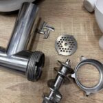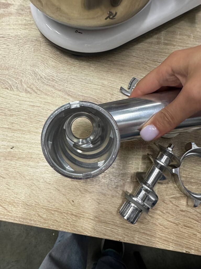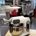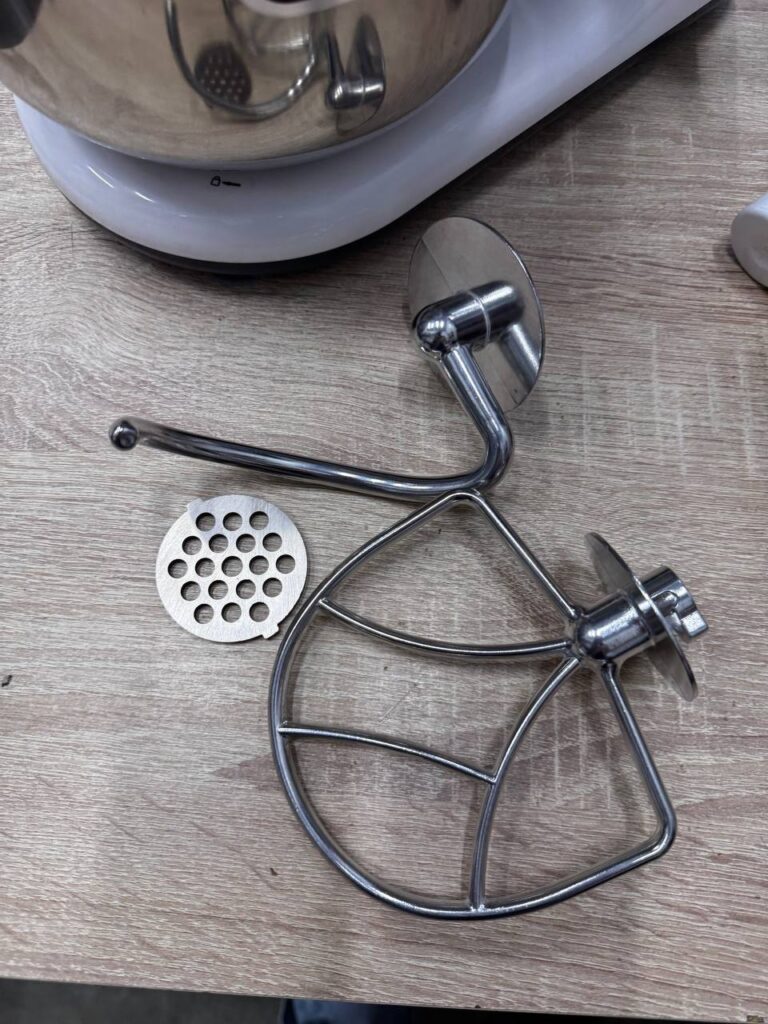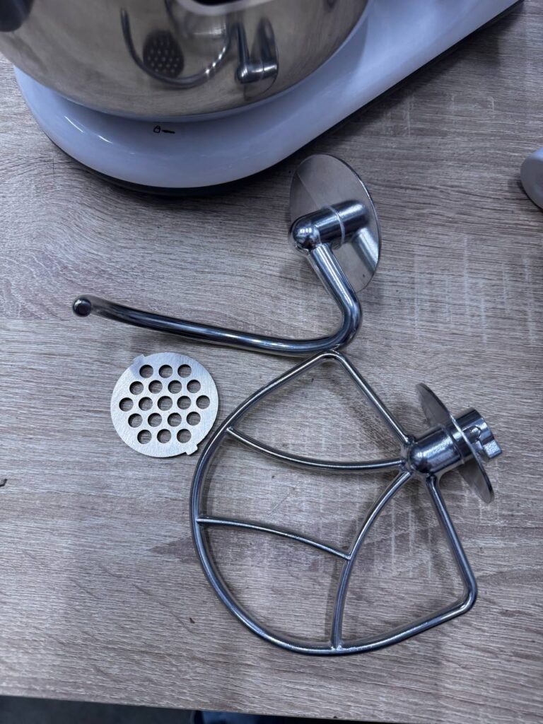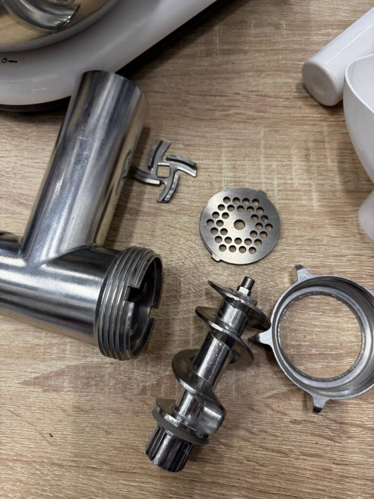 Чаша емкостью 5 л изготовлена из нержавеющей стали, стакан блендера объемом 1,5 л — из стекла. Для мясорубки в комплекте есть два диска с отверстиями диаметром 5 мм и 7 мм.