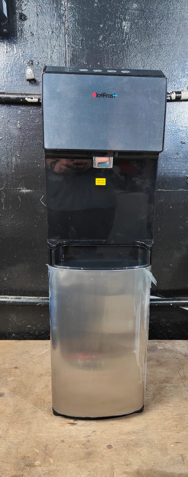 Напольный диспенсер HotFrost V450ASM, облаченный в узкий и высокий корпус серебристо-черного цвета, станет удобным решением для посетителей офиса или общественного заведения.