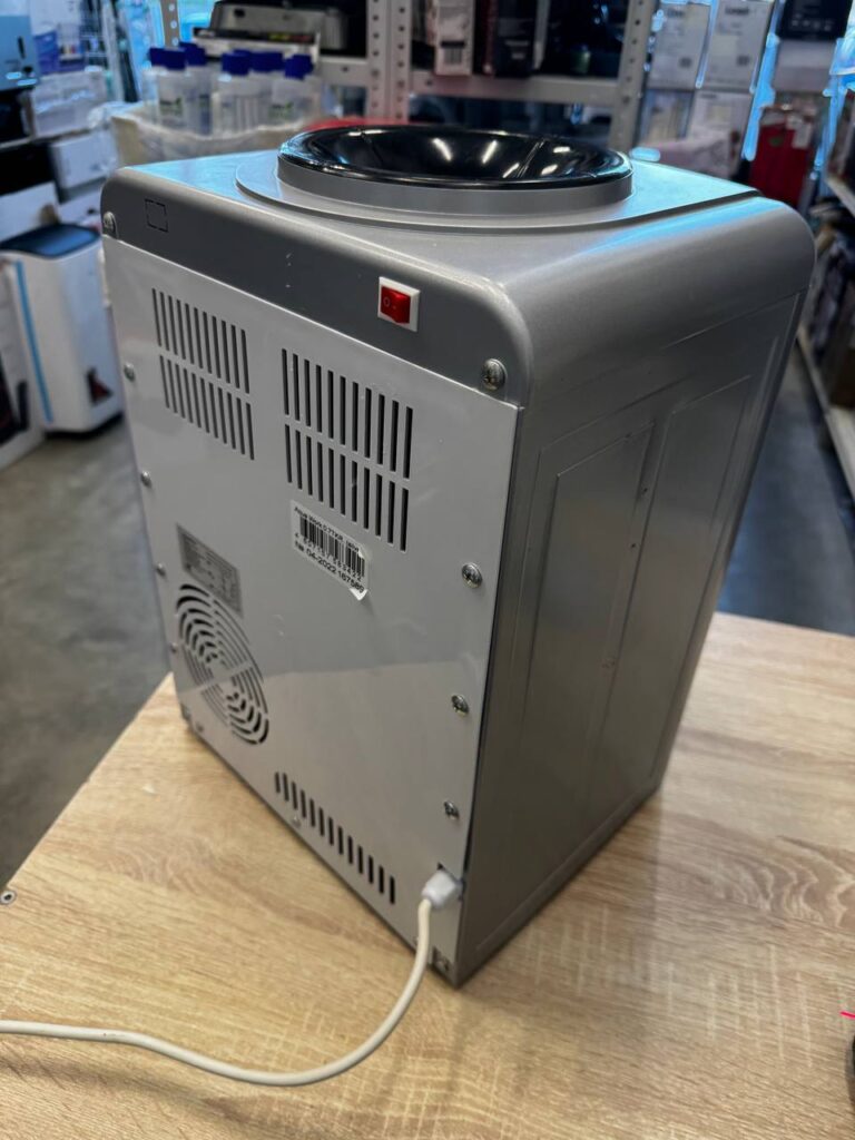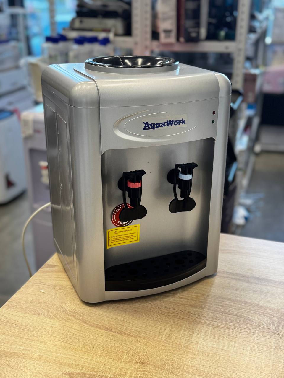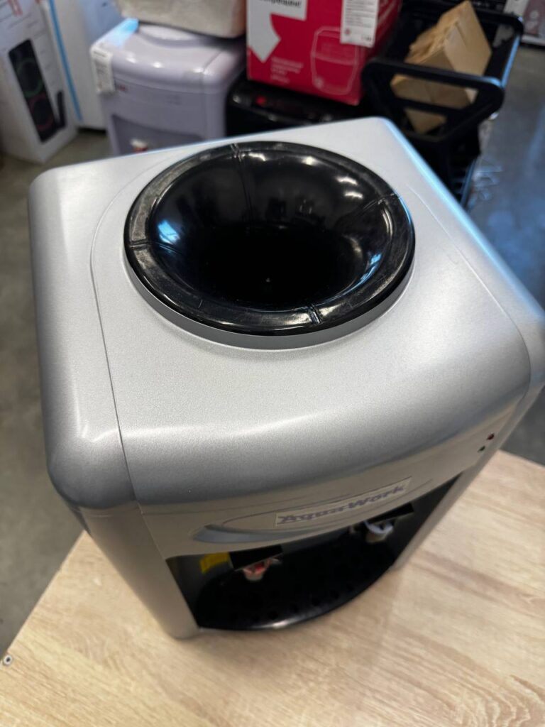 Настольный диспенсер Aqua Work 0.7TKR представлен в сером корпусе с 2 кранами и резервуаром для 1 л холодной воды. Верхнее расположение бутыли упрощает замену тары. Такая конструкция позволяет легко отслеживать количество оставшейся воды, но требует точной установки емкости.