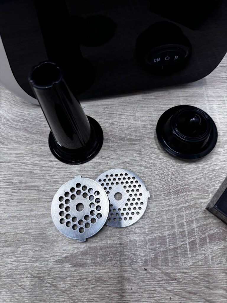 Корпус мясорубки имеет современный дизайн и встроенный отсек для хранения насадок. Лоток для подачи мяса – стальной.