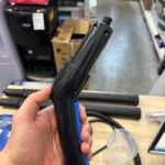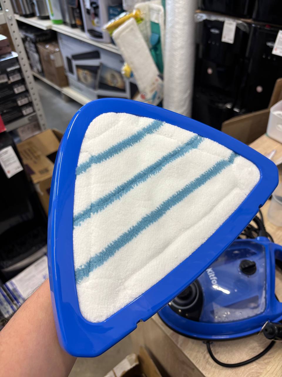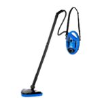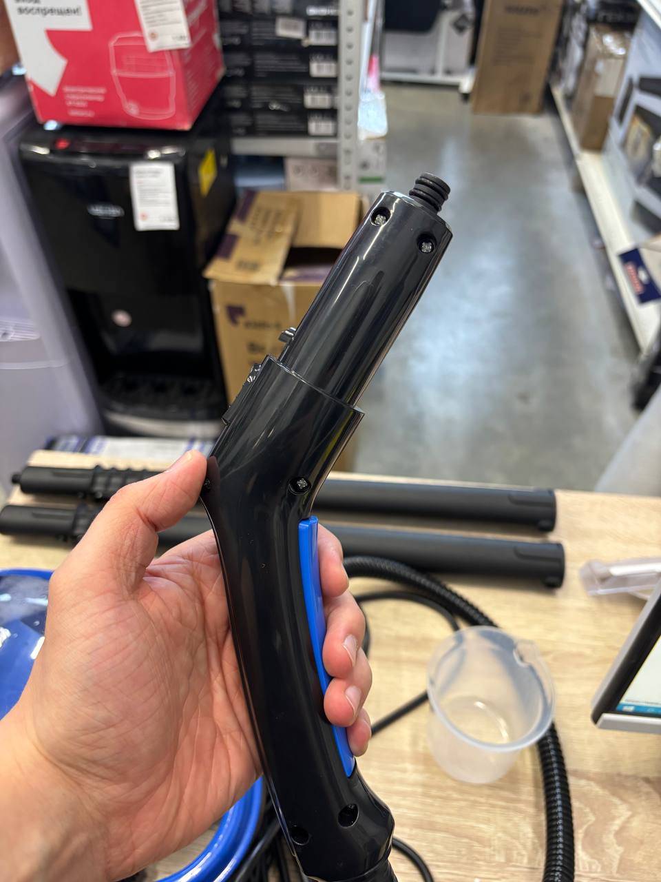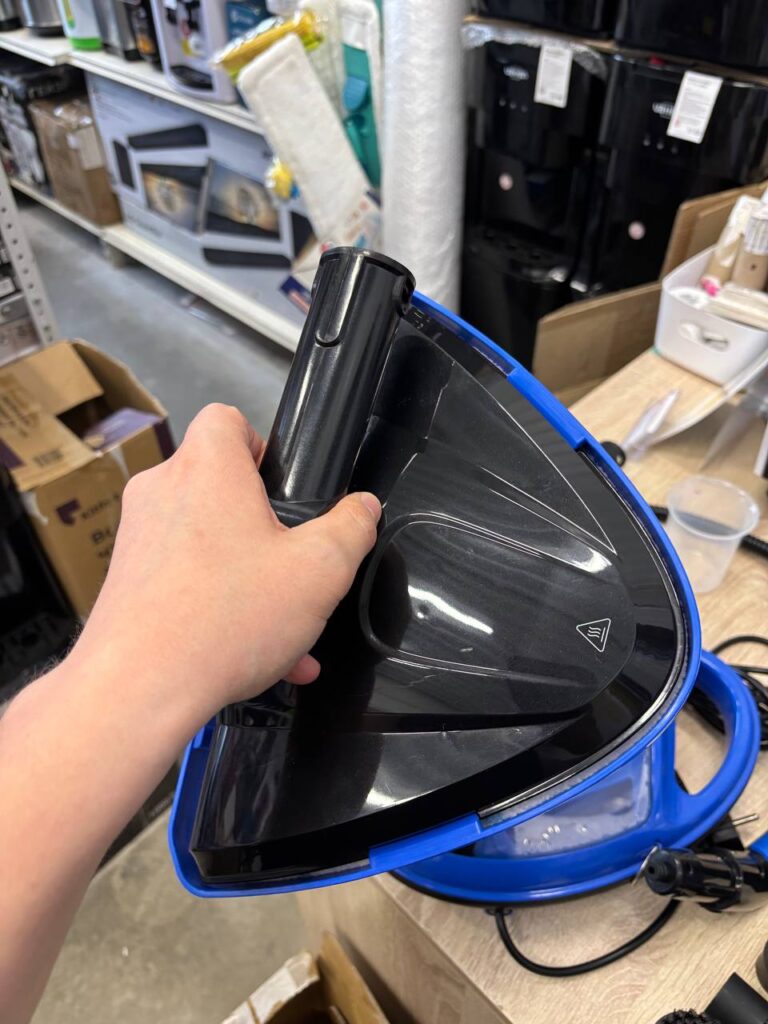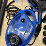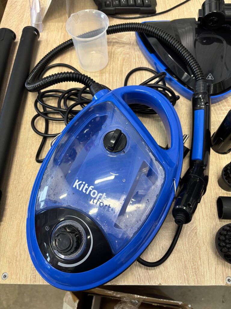 Ручной пароочиститель Kitfort КТ-9158-3 представлен в синем корпусе с удобным расположением клавиши включения и регулятора мощности.