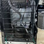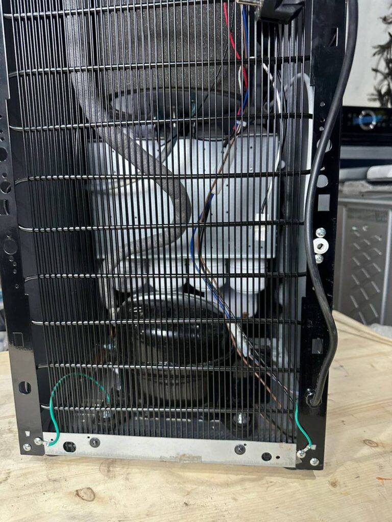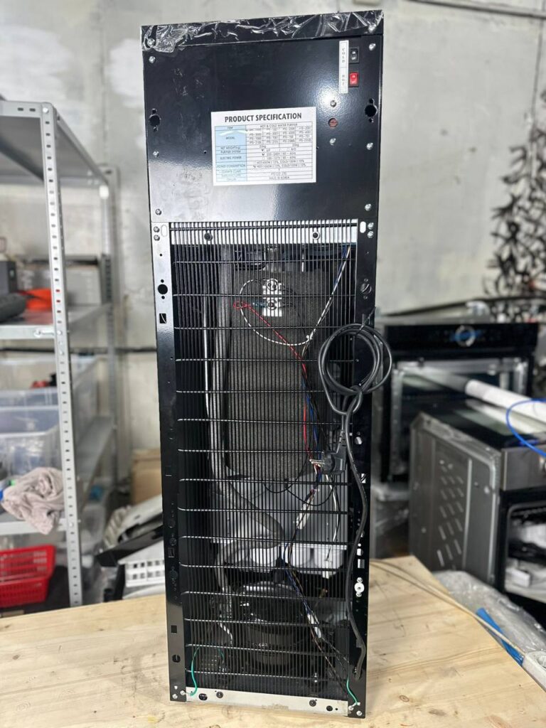 Внутри корпуса размещен компрессор, сжимающий фреон. На обратной стороне закреплена радиаторная решетка, которая его охлаждает. Прибор устанавливается на ножки, что делает его устойчивым на поверхности.