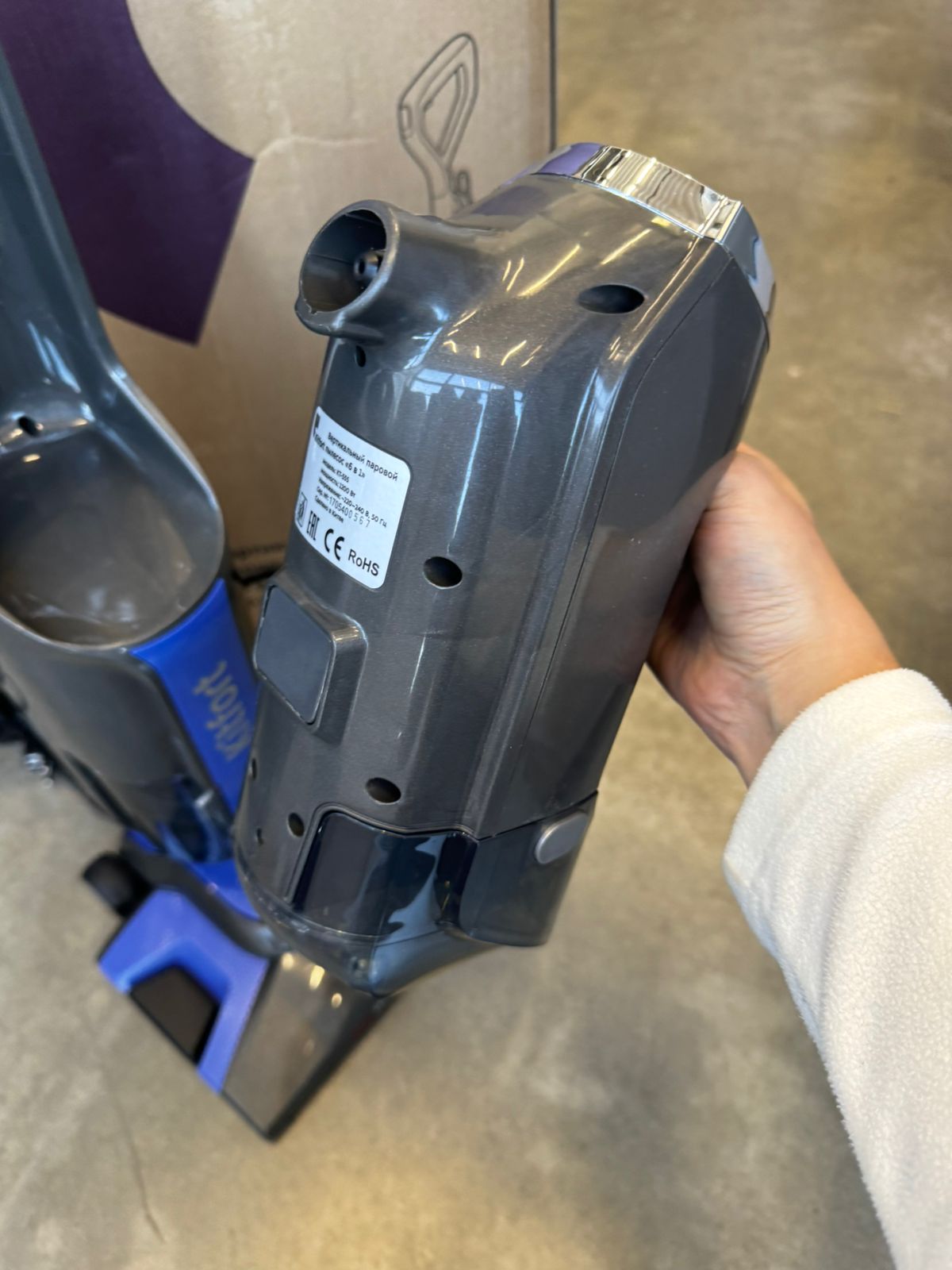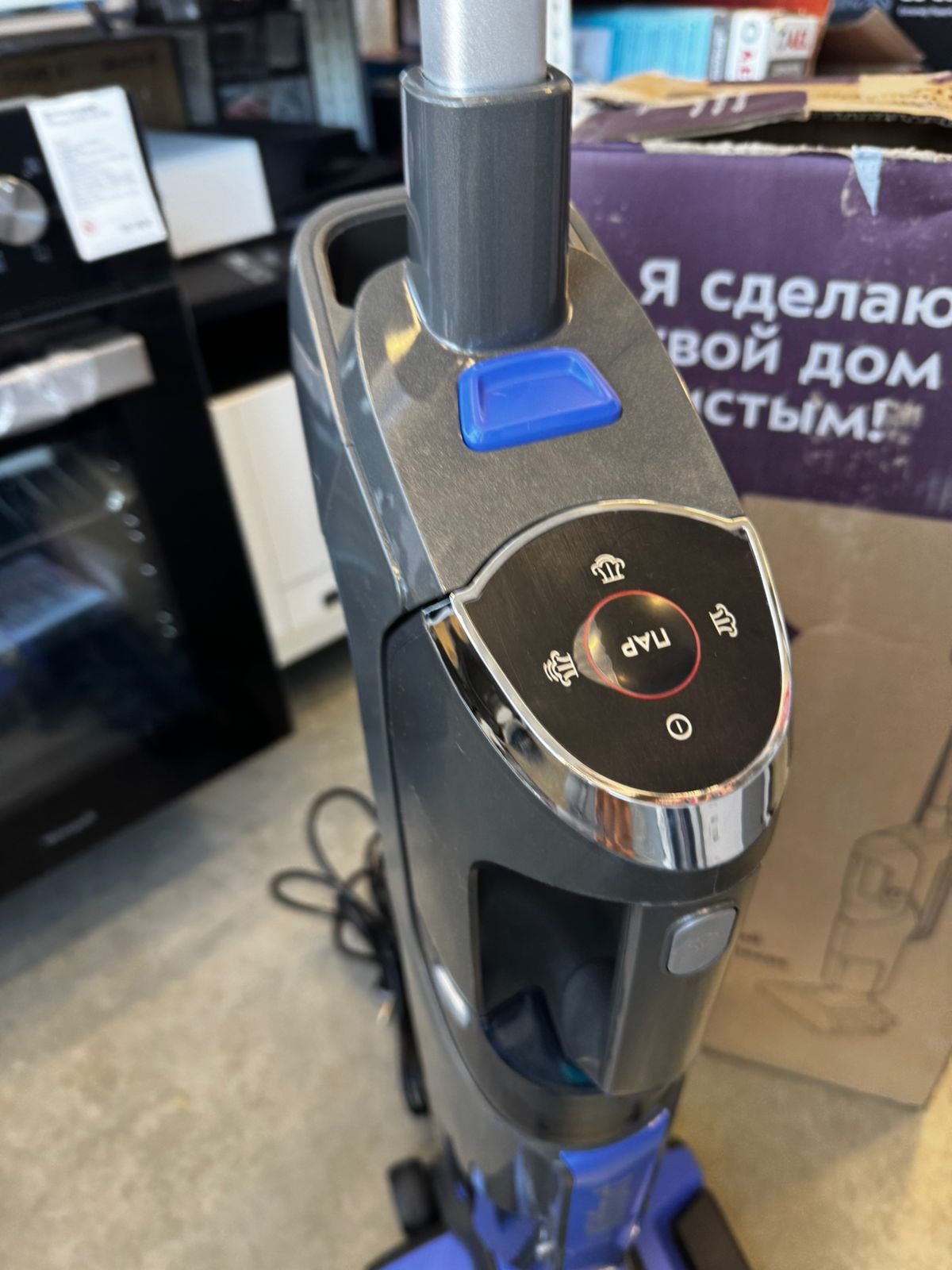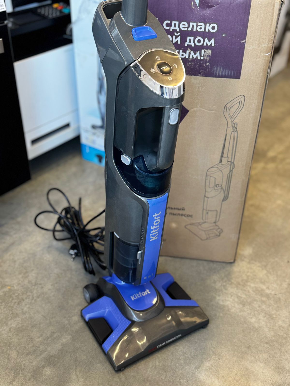 Особенность пылесоса в поддержке функции генерации пара. Корпус устройства выполнен в синем цвете и традиционно имеет торпедообразную конструкцию.
