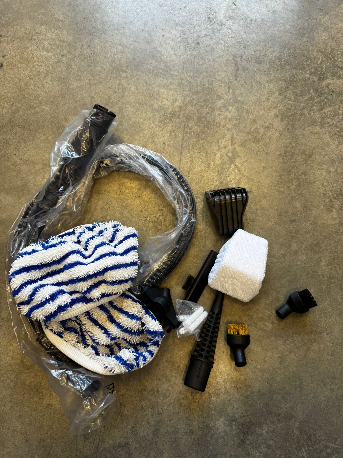 Пылесос не предусматривает систему сматывания кабеля: шнур наматывается на два поворотных крюка на задней части корпуса. Для уборки пылесос использует щетку для пола с возможностью закрепления на ней держателя с салфеткой для отпаривания.