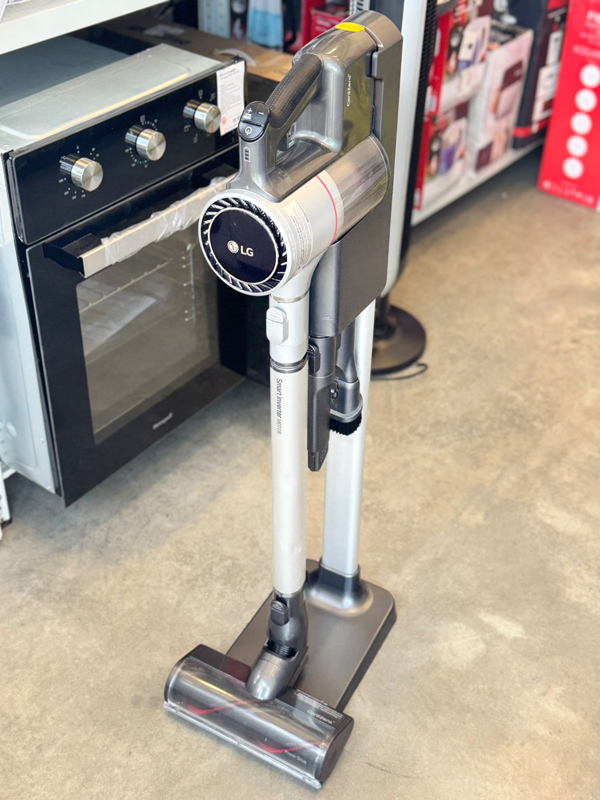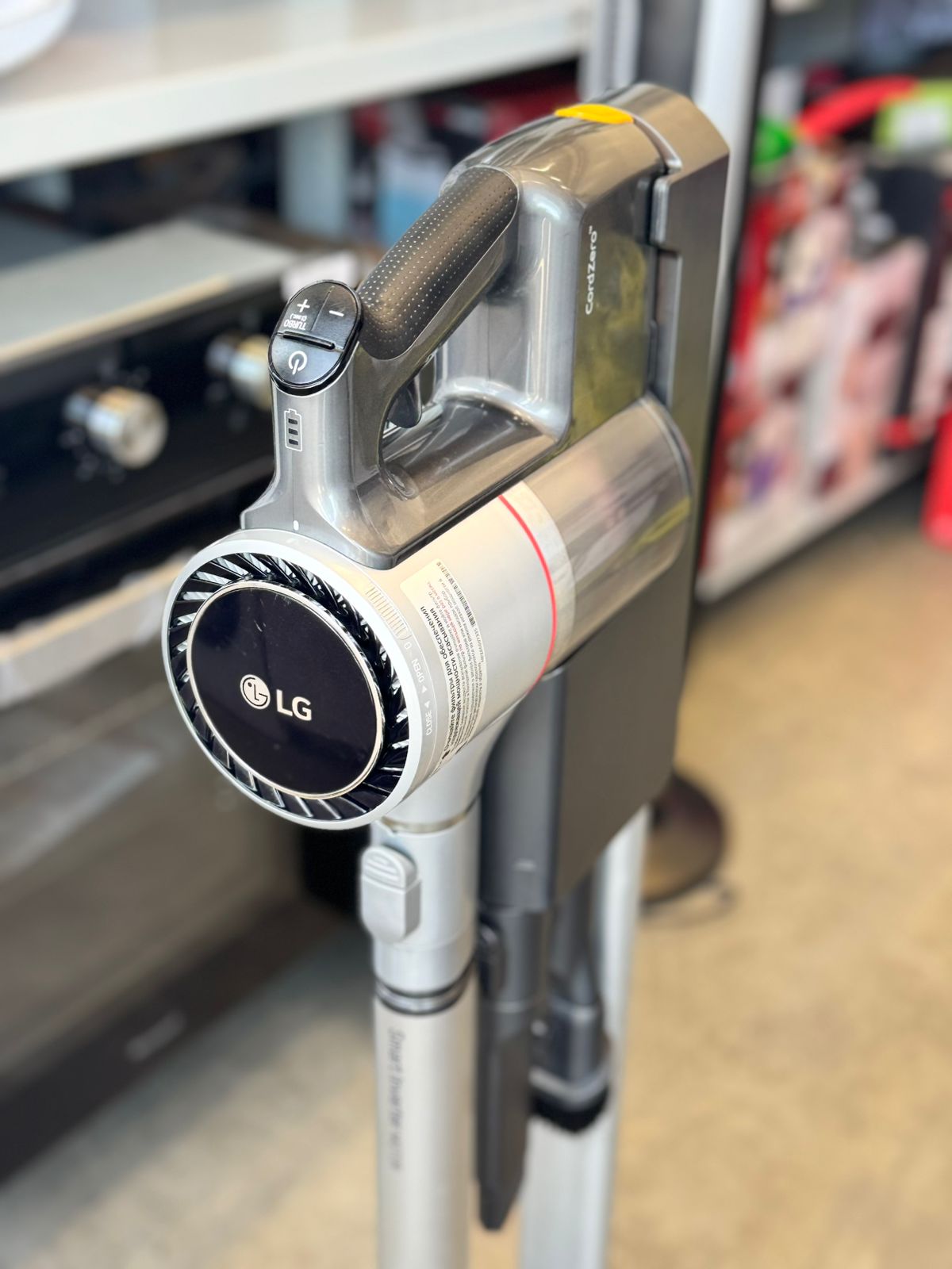 Аккумуляторный пылесос LG CordZero A9N-Core черно-серого цвета работает на базе мотора Smart Inverter Motor с вакуумной технологией Aeroscience, которая отвечает за создание небольших вихрей для отделения частиц пыли от воздуха.