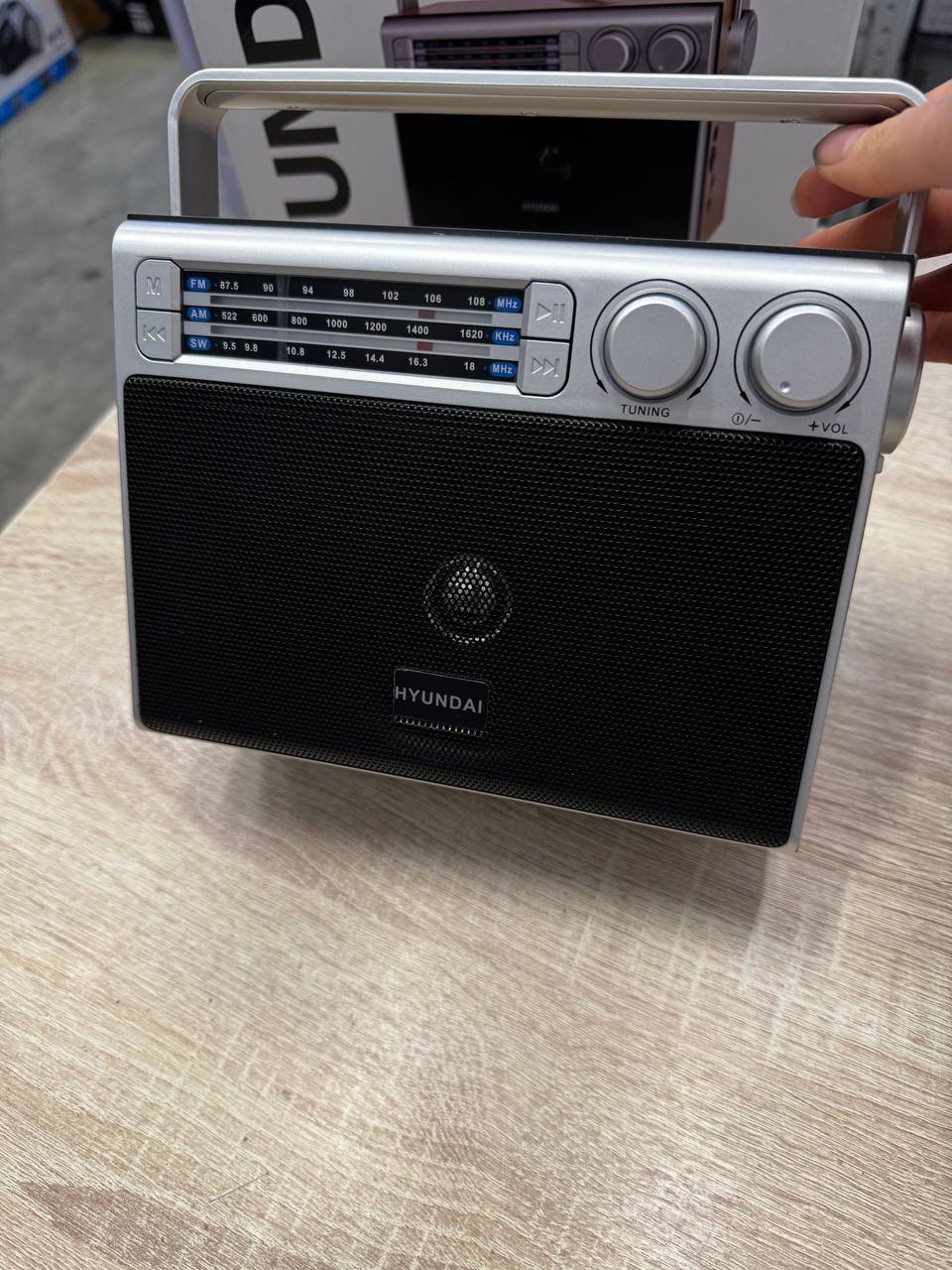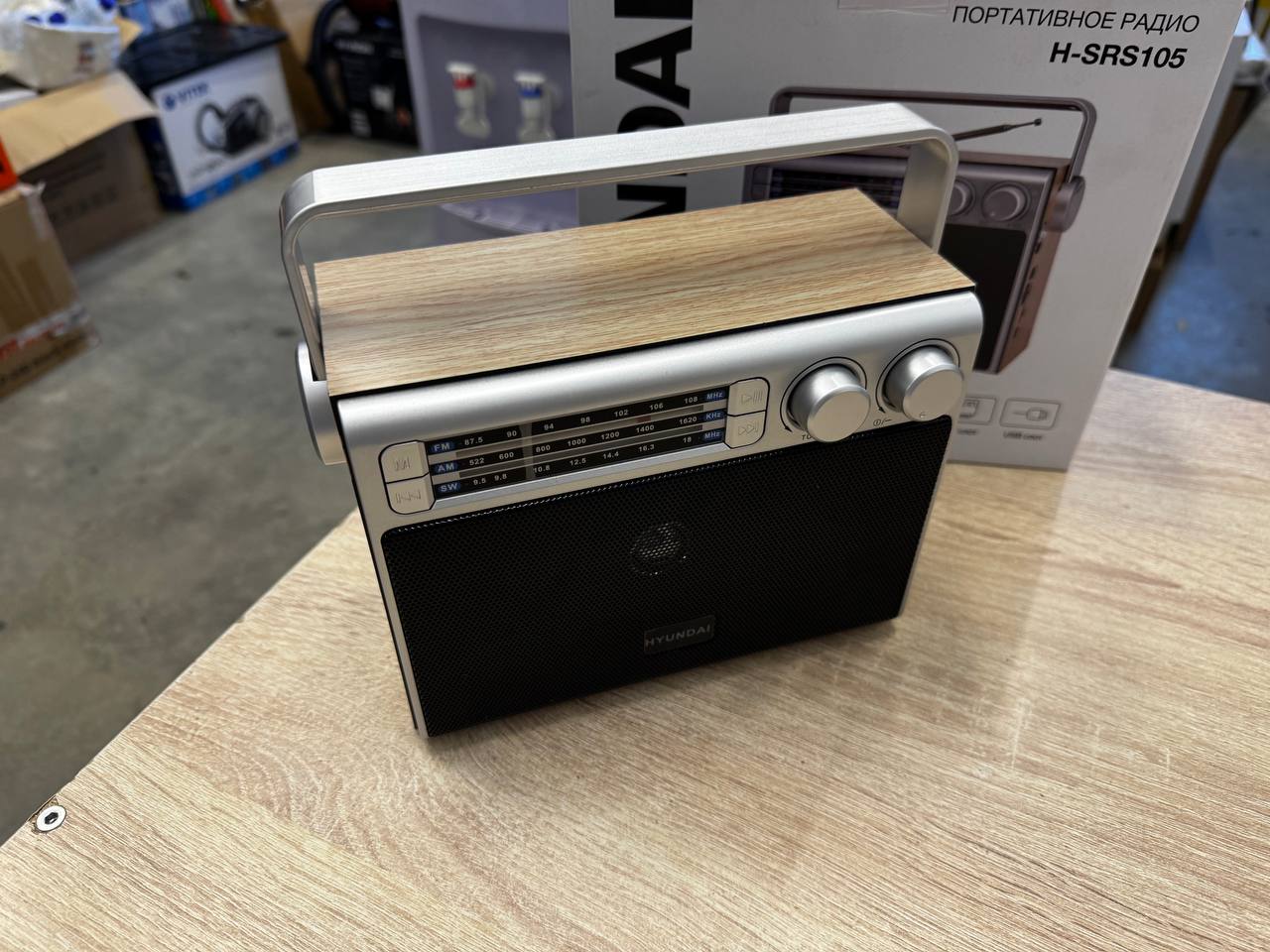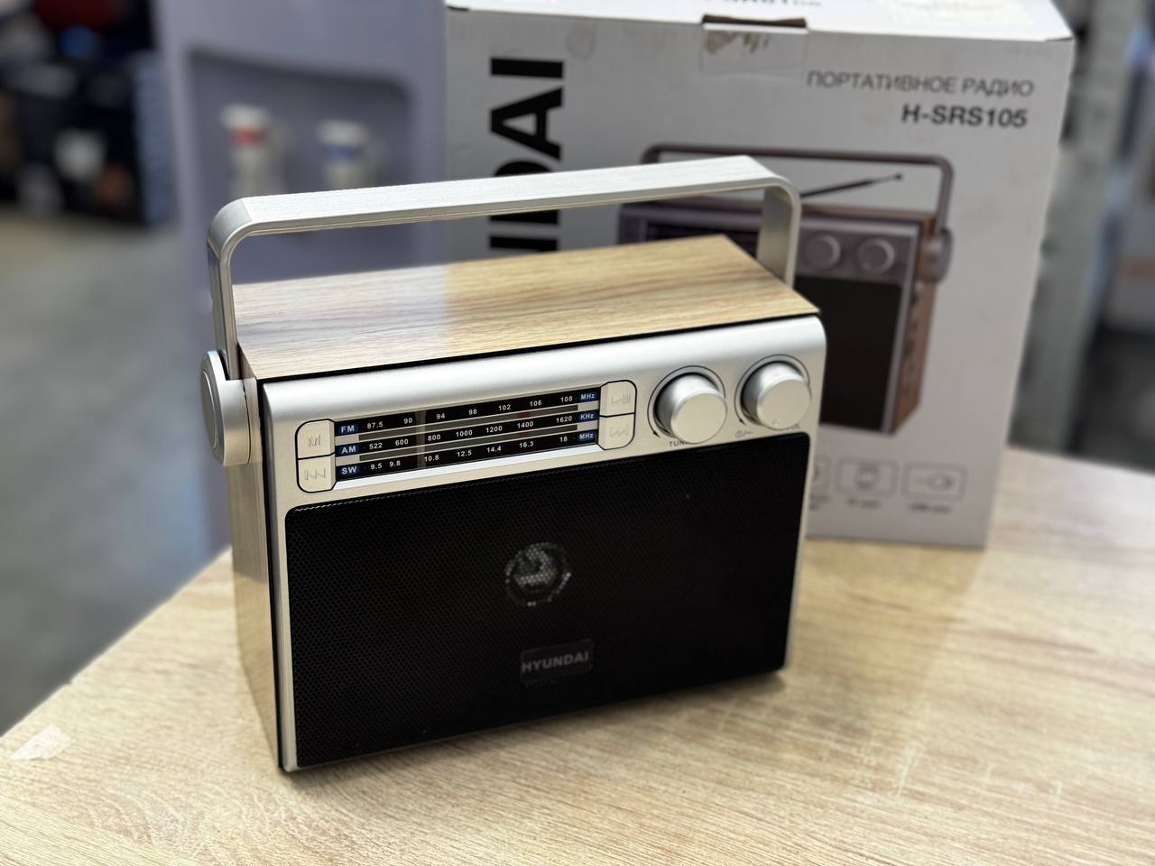 Hyundai H-SRS105 дополнен телескопической антенной и ручкой для переноски. Работать он может как от розетки, так и от собственного аккумулятора (до 7 часов) или батареек. Весит приемник меньше 1 кг.