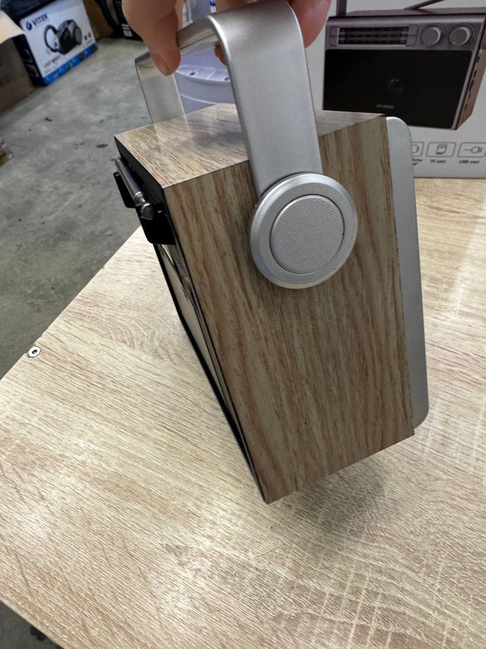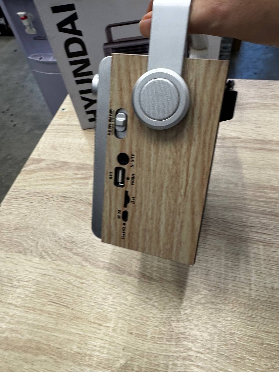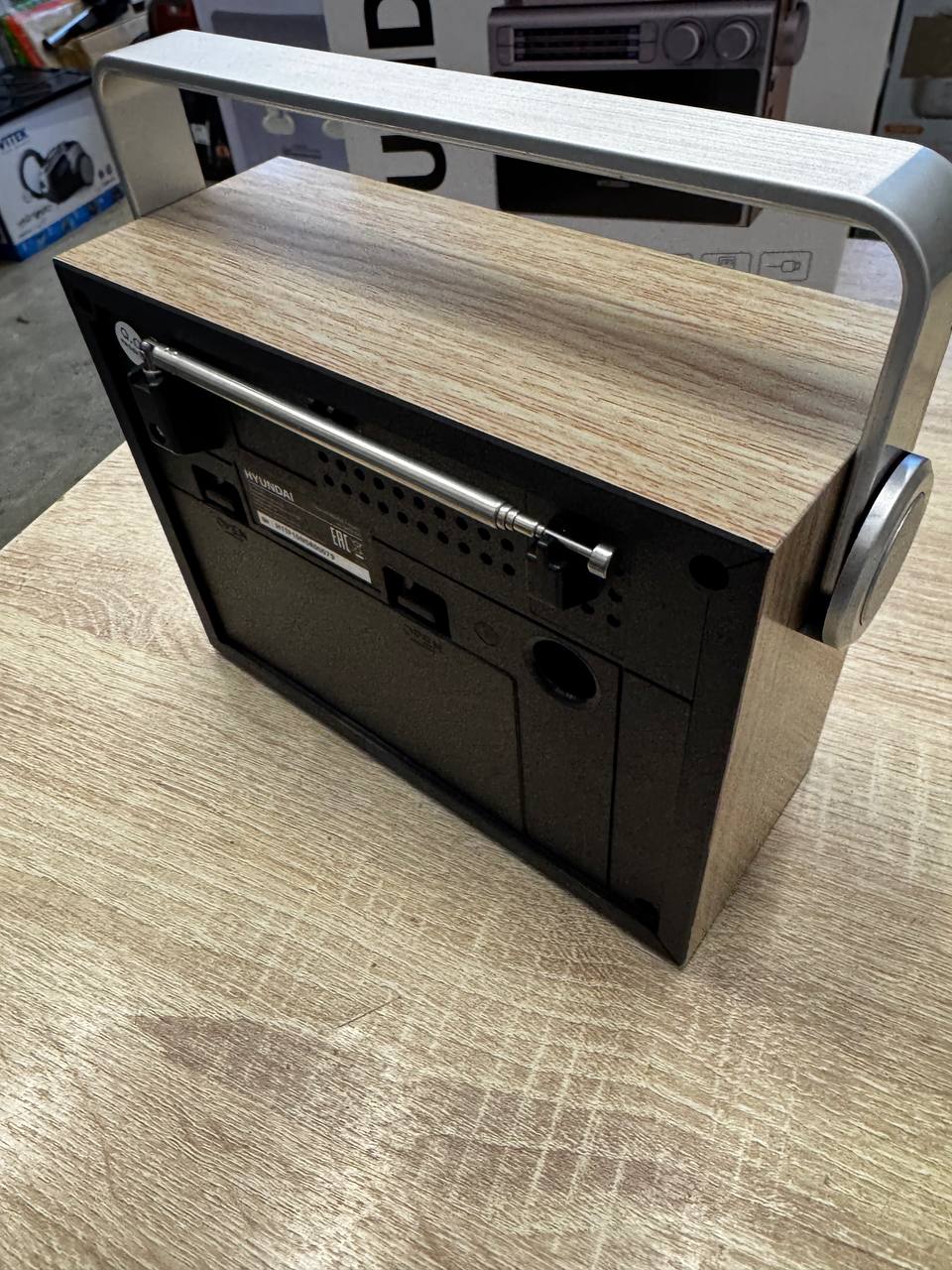 Hyundai H-SRS105 дополнен телескопической антенной и ручкой для переноски. Работать он может как от розетки, так и от собственного аккумулятора (до 7 часов) или батареек. Весит приемник меньше 1 кг.