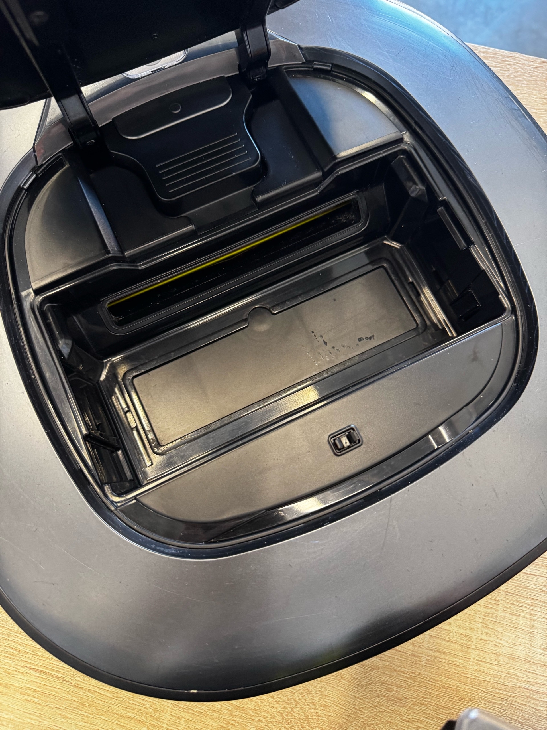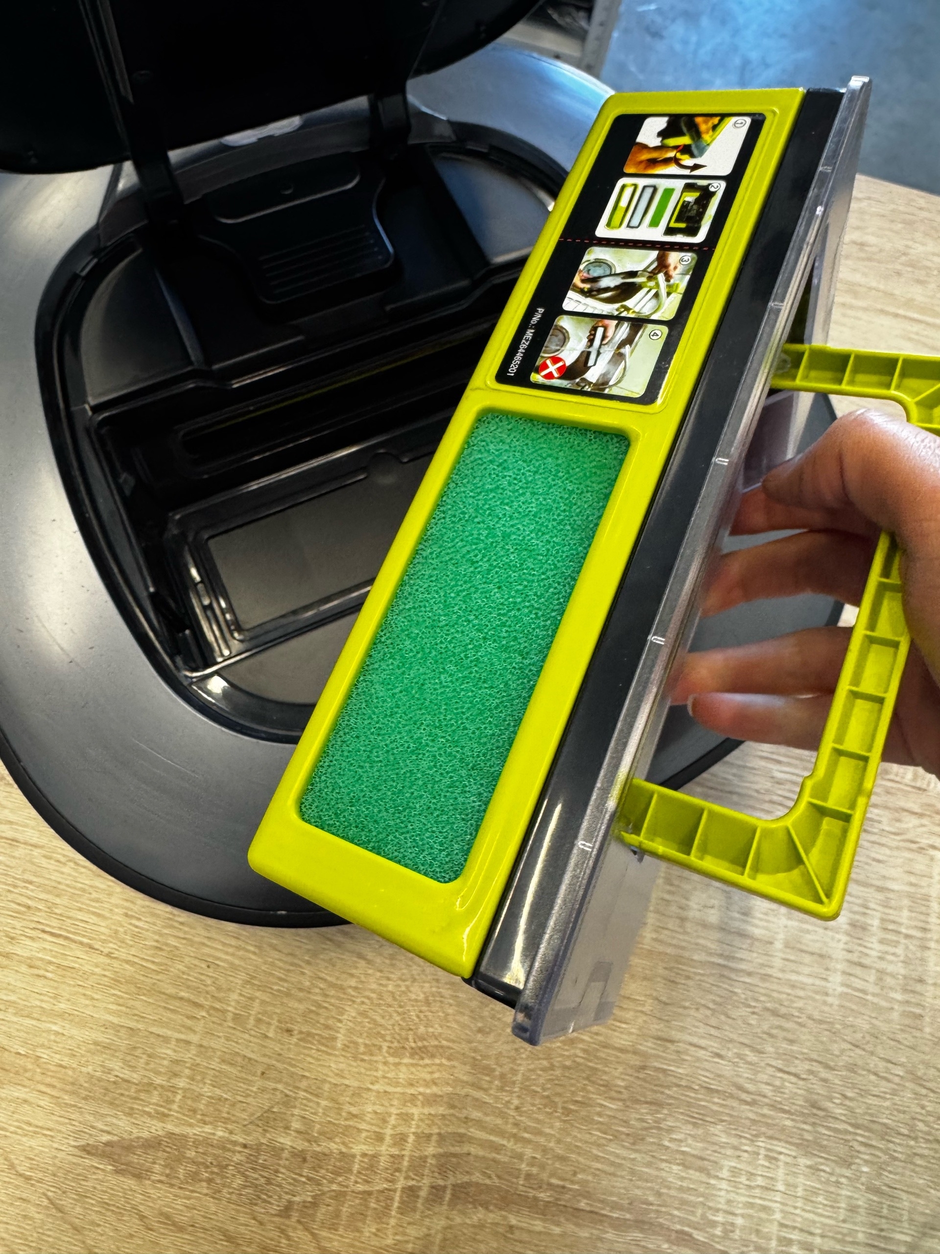 Объём контейнера-пылесборника составляет 0,6 л. Он расположен сверху, поэтому, чтобы извлечь его, нужно лишь открыть крышку лёгким касанием. Бокс оснащён ручкой для удобства переноса и очистки – контакт с мусором минимален. Выходной фильтр тонкой очистки HEPA 11 не даст мельчайшим пылинкам проникнуть обратно в помещение.
