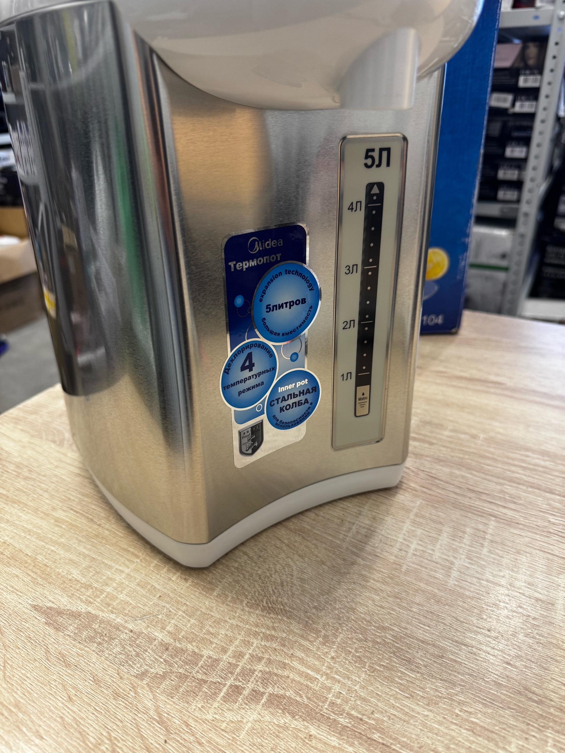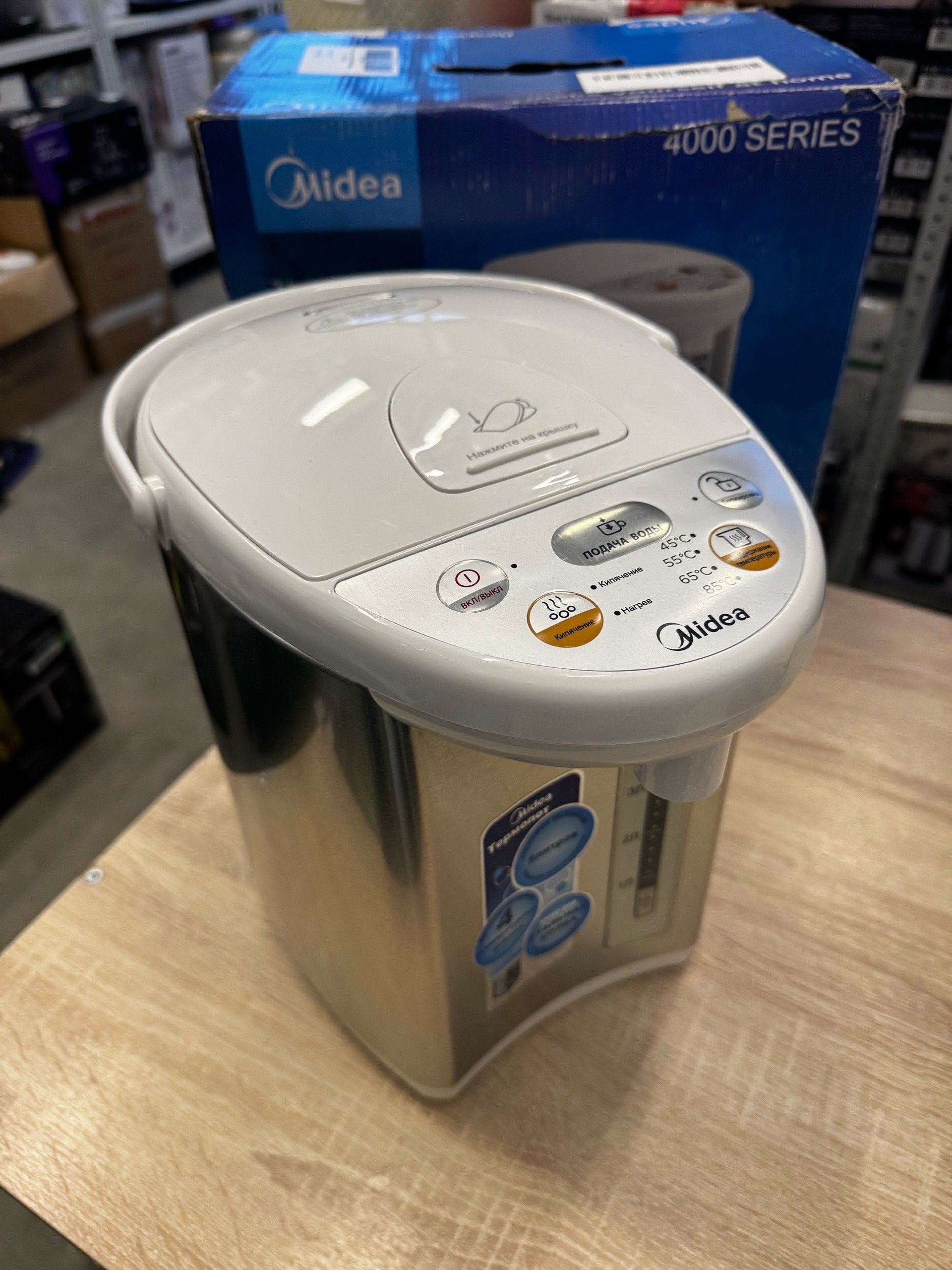 Термопот Midea MP-8104 мощностью 750 Вт оборудован опцией, которая удаляет хлор.
