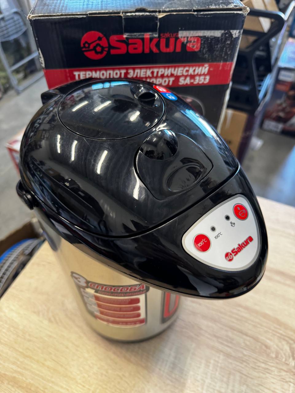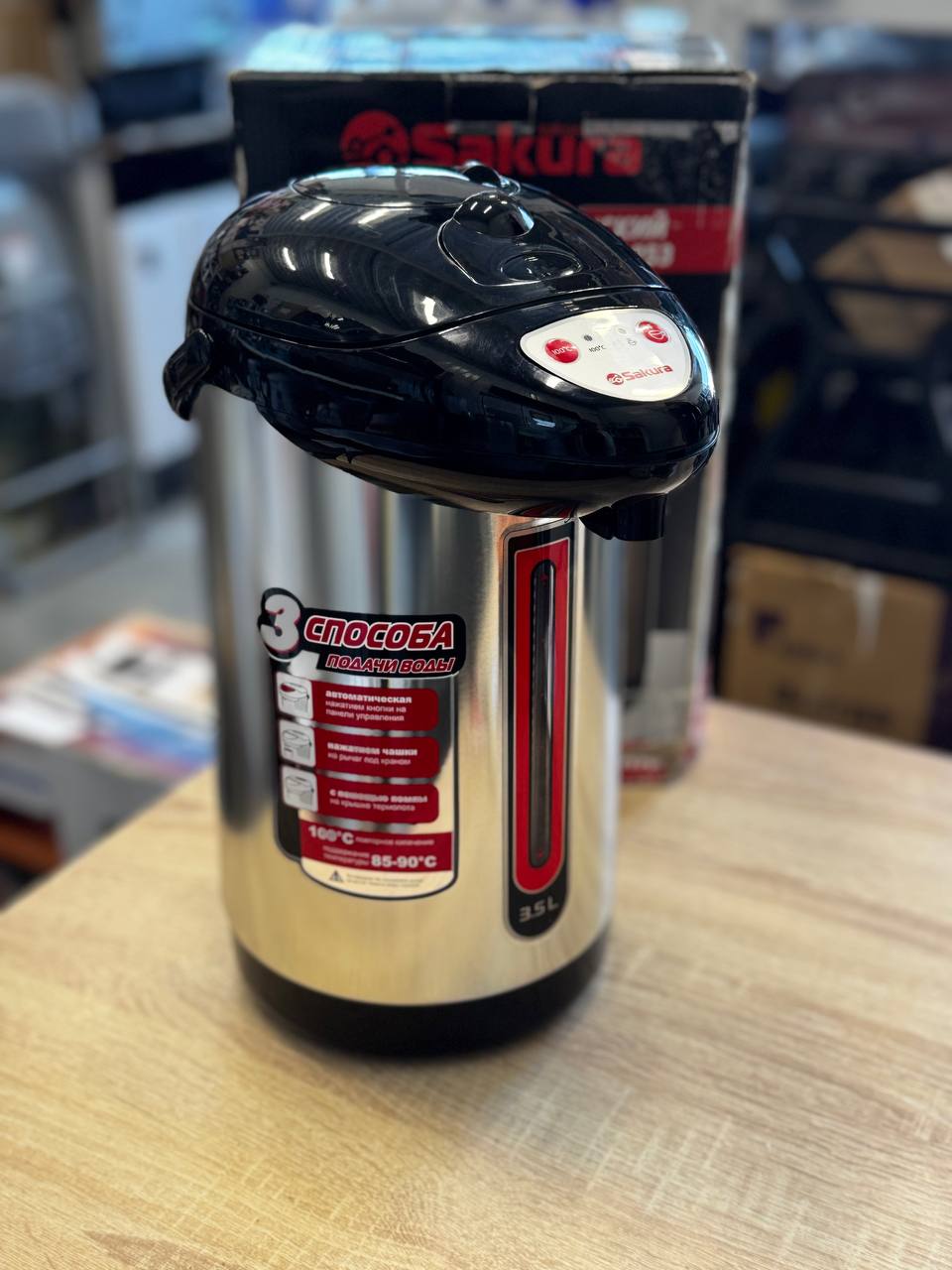 Термопот Sakura SA-353RS. Объем резервуара для воды — 3,5 л. Максимальная мощность — 750 Вт. Есть индикатор уровня воды, функция «Повторное кипячение» и режим поддержания температуры в пределах от 85°С до 90°С. Если резервуар пустой, срабатывает автоматическое отключение прибора. Управление механическое. Корпус выполнен из металла, устойчивого к деформациям и механическим повреждениям. В комплекте поставляется фильтр от накипи.