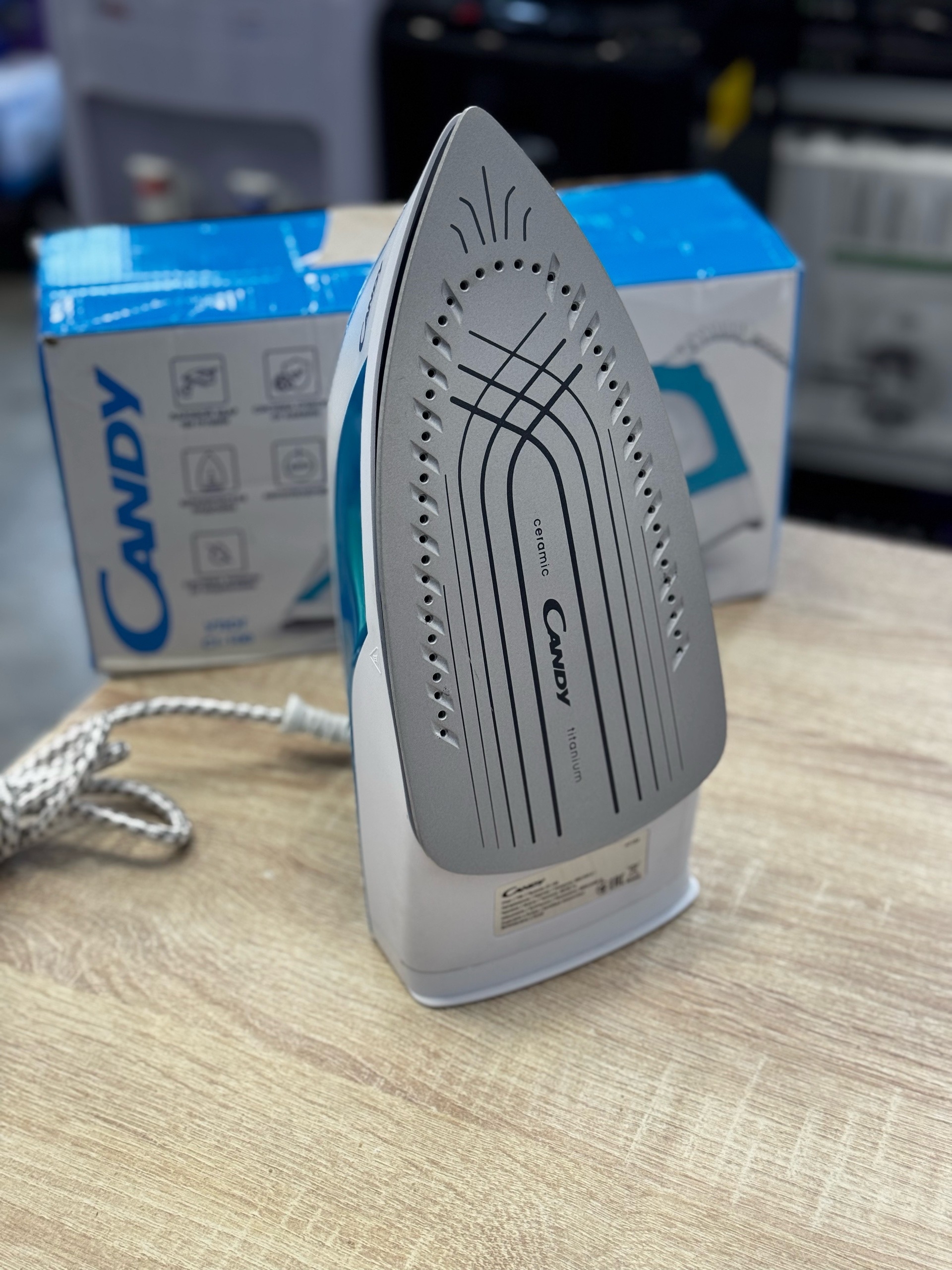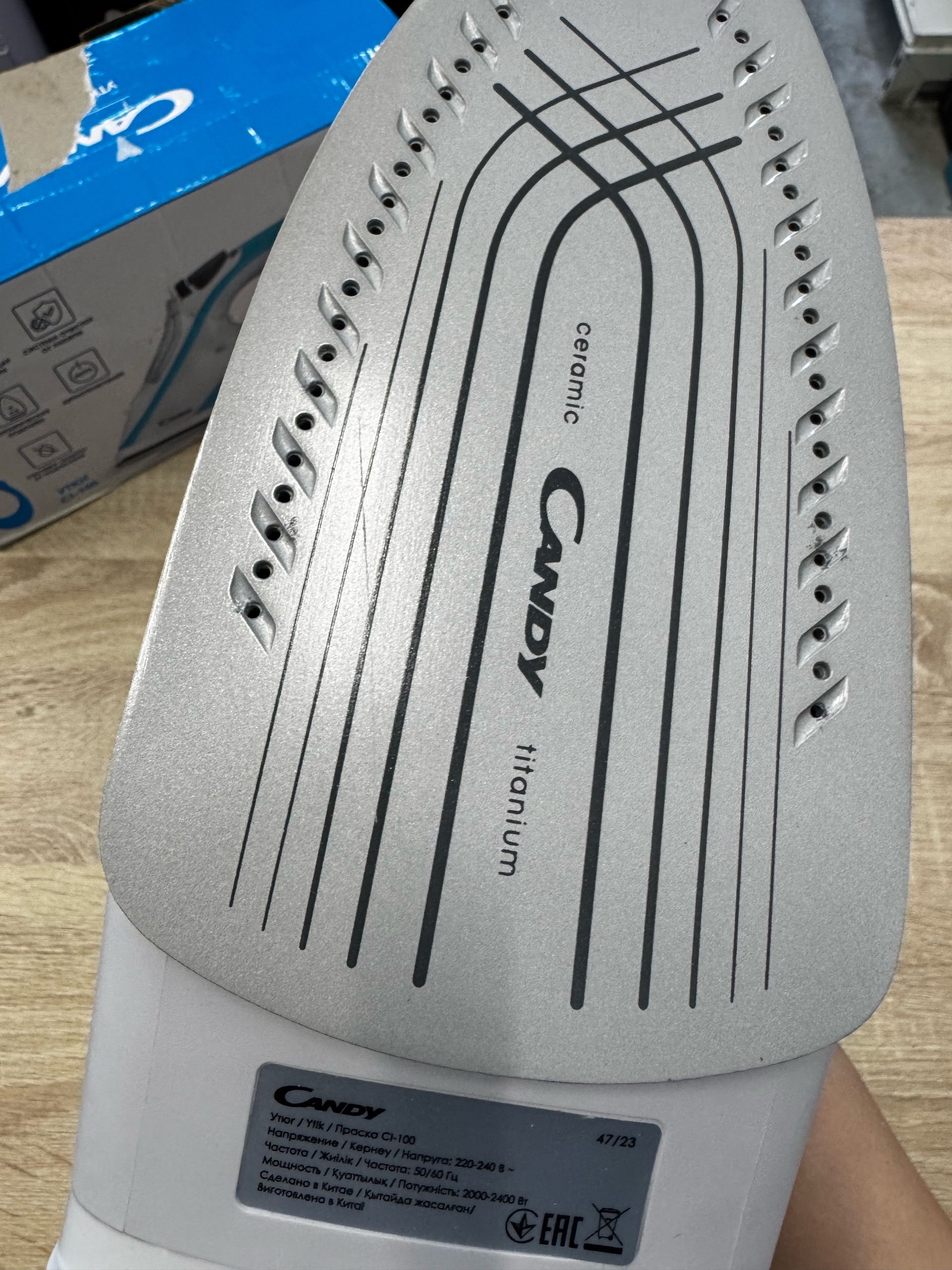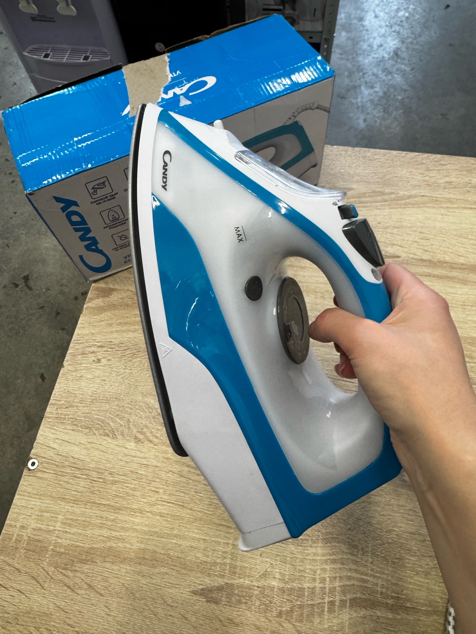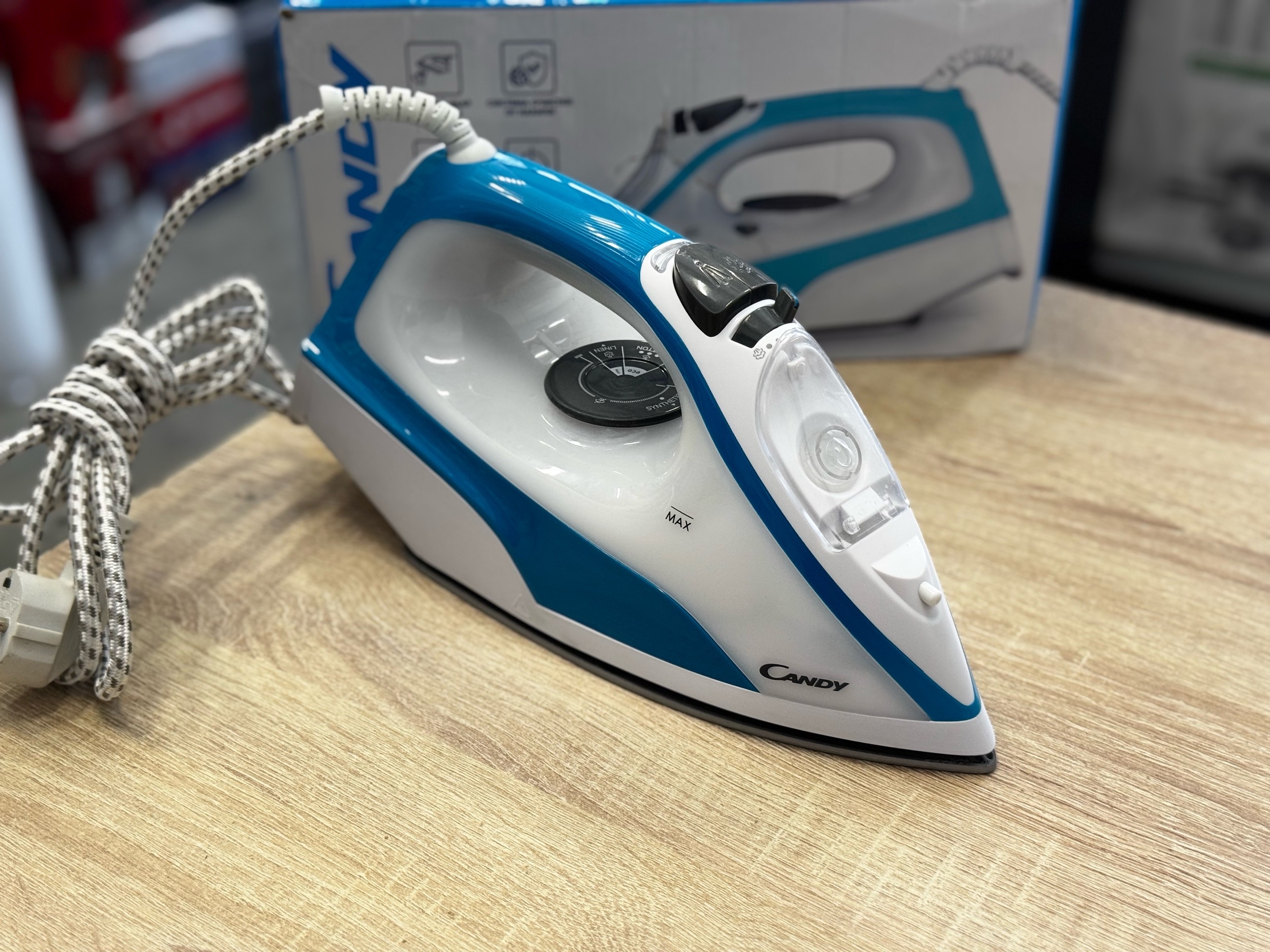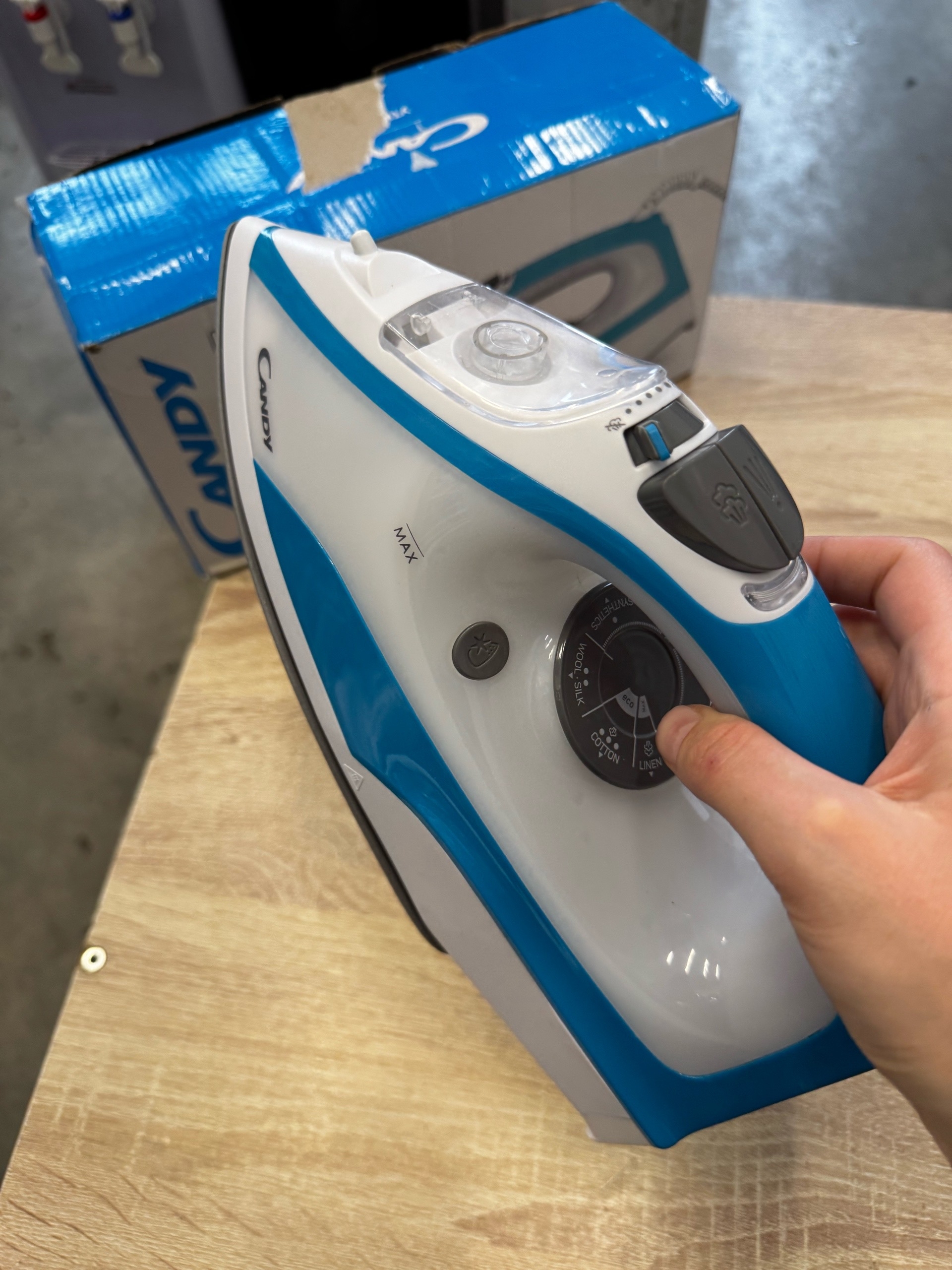 Утюг Candy CI-100 представлен в корпусе бело-голубой расцветки. У модели четыре режима работы, выбор температуры нагрева осуществляется с помощью поворотного переключателя.