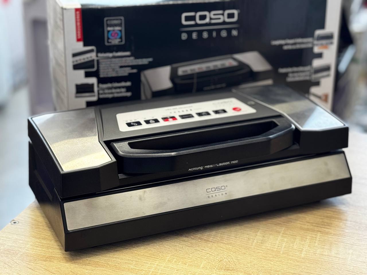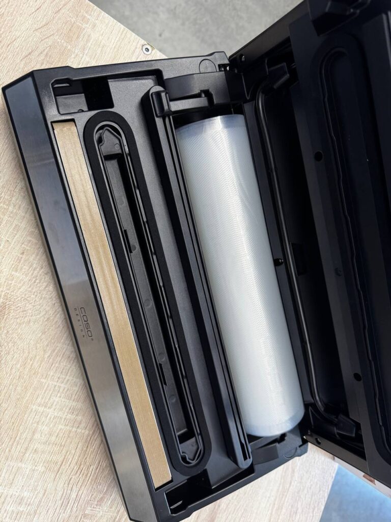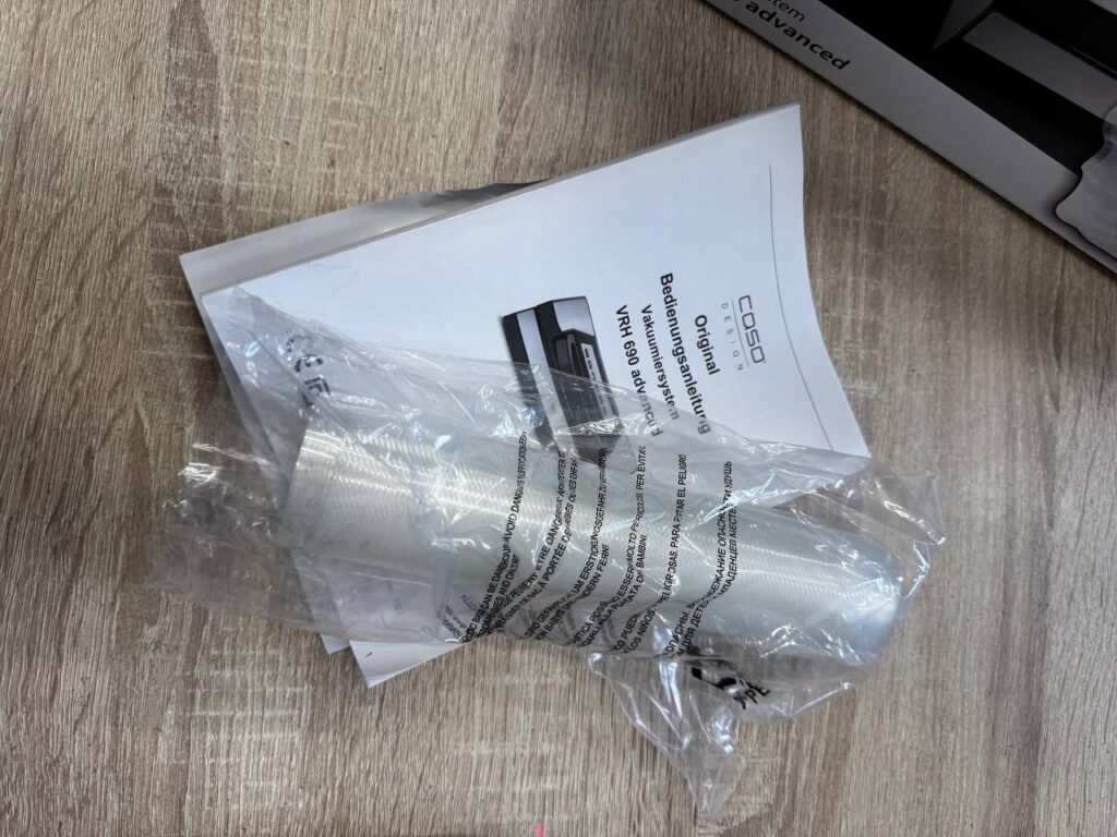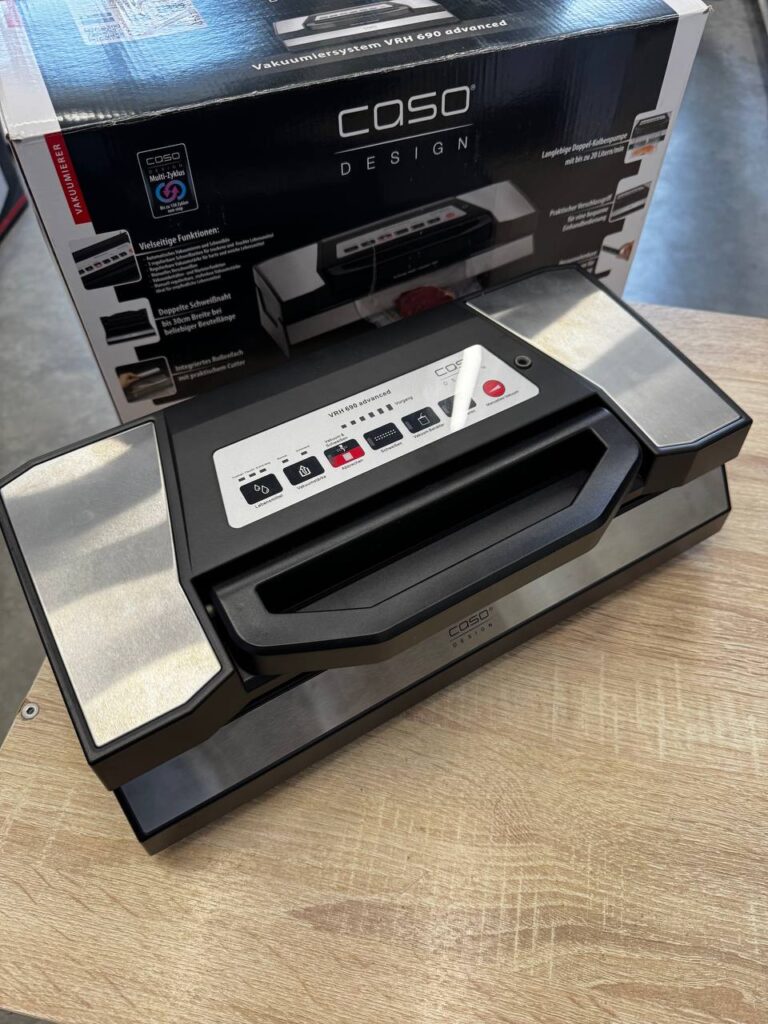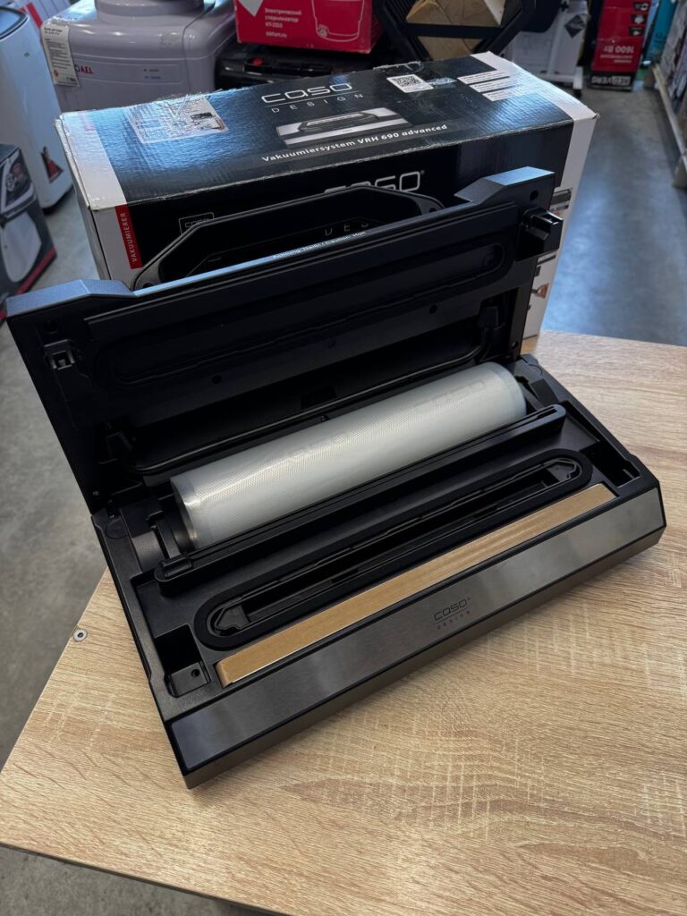 CASO VRH 690 работает от стандартной сети 220-240 В с потреблением 130 Вт. Модель со встроенным резаком идет в комплекте с двумя рулонами пленки 20×300 см и 28×300 см, вакуумным шлангом и съемным поддоном для сбора жидкости. Вы можете использовать 1 из 7 режимов, включая автоматическую программу и ручной контроль за степенью откачивания воздуха.
