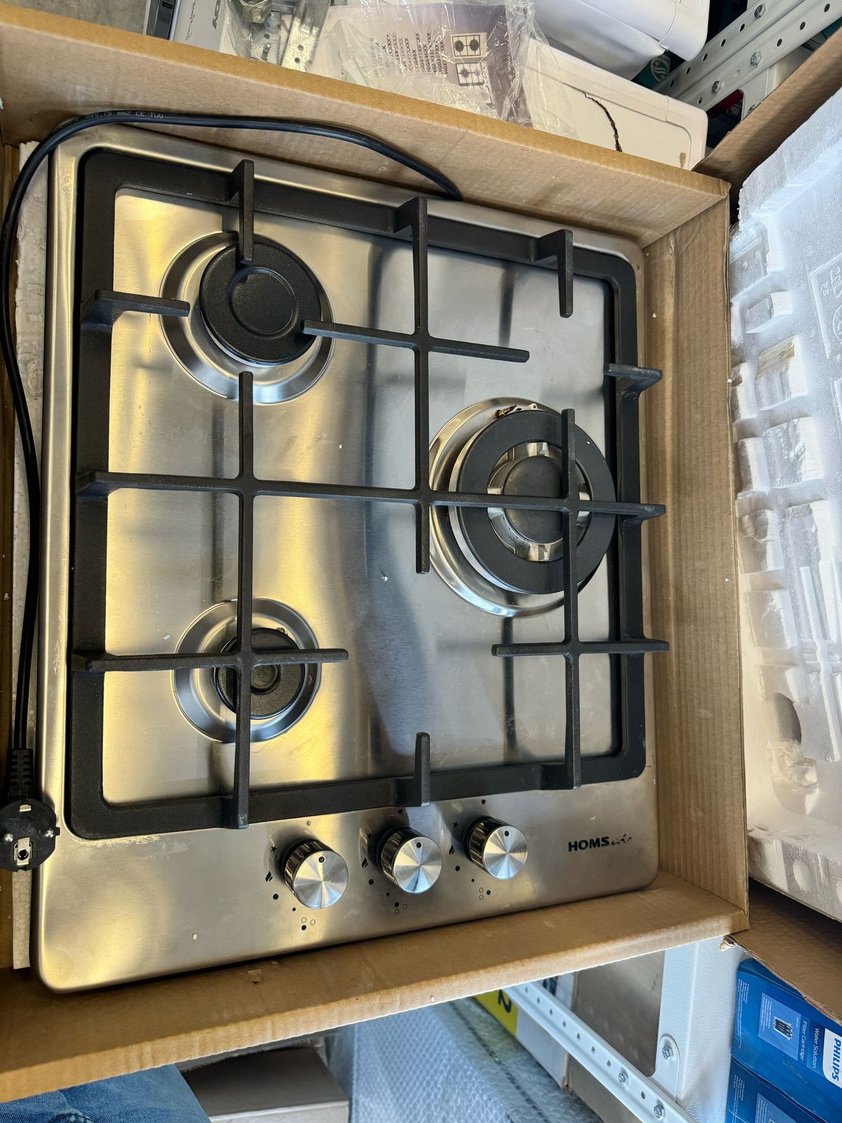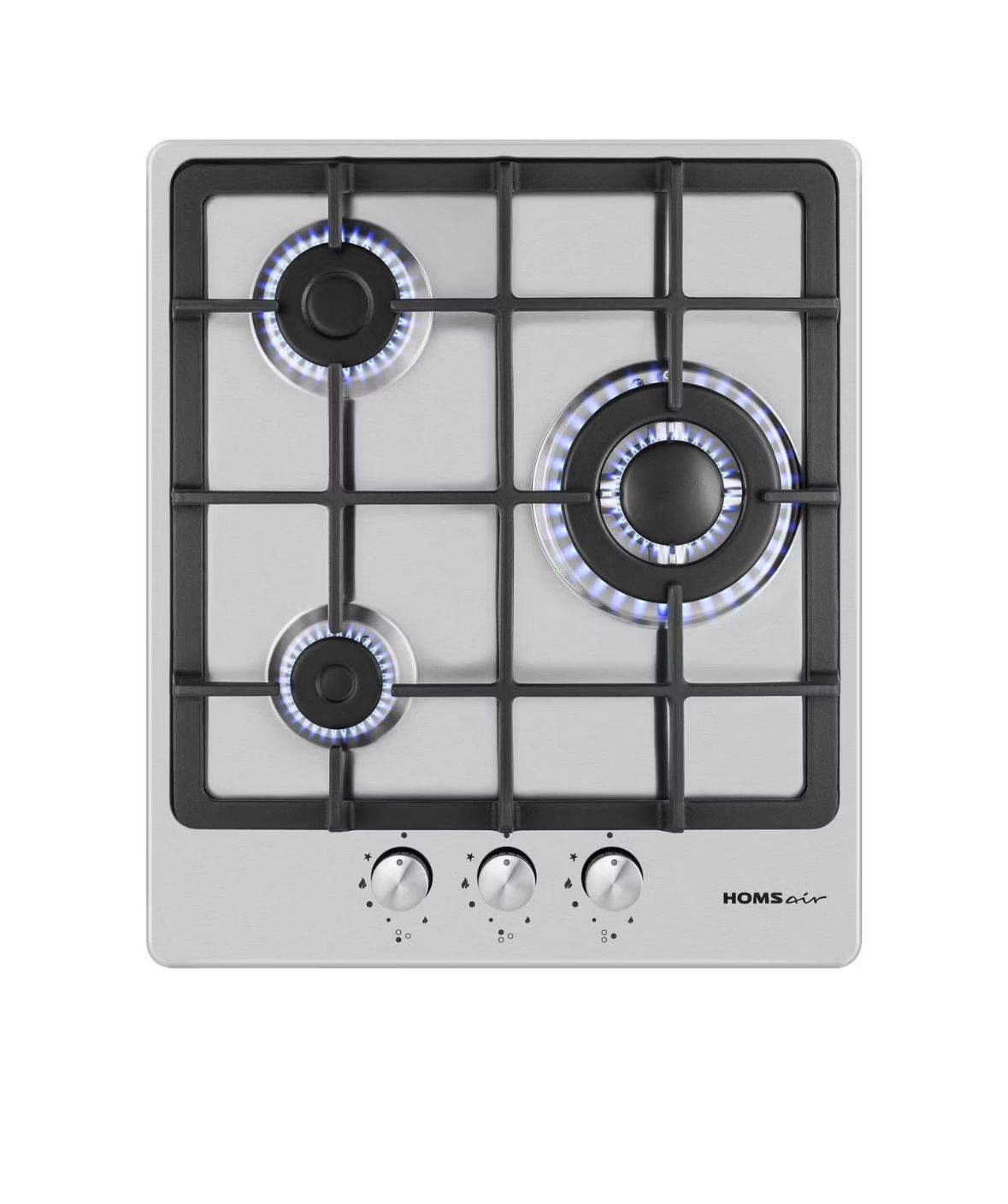 Независимая встраиваемая газовая панель HomsAir HGS433TGCS оснащена тремя конфорками разного размера с механическим электроподжигом.