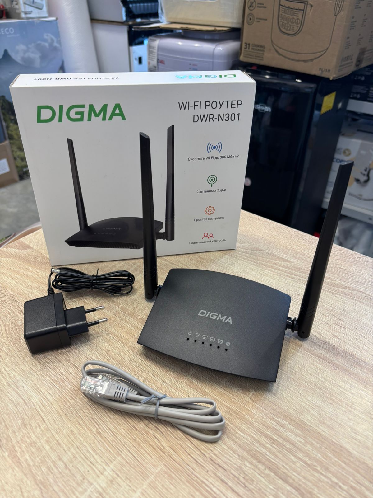 Digma DWR-N301 – надежный домашний Wi-Fi-роутер с простой и быстрой настройкой. Маршрутизатор оснащен 4 сетевыми портами: одним WAN и тремя LAN со скоростью 100 Мбит/с.